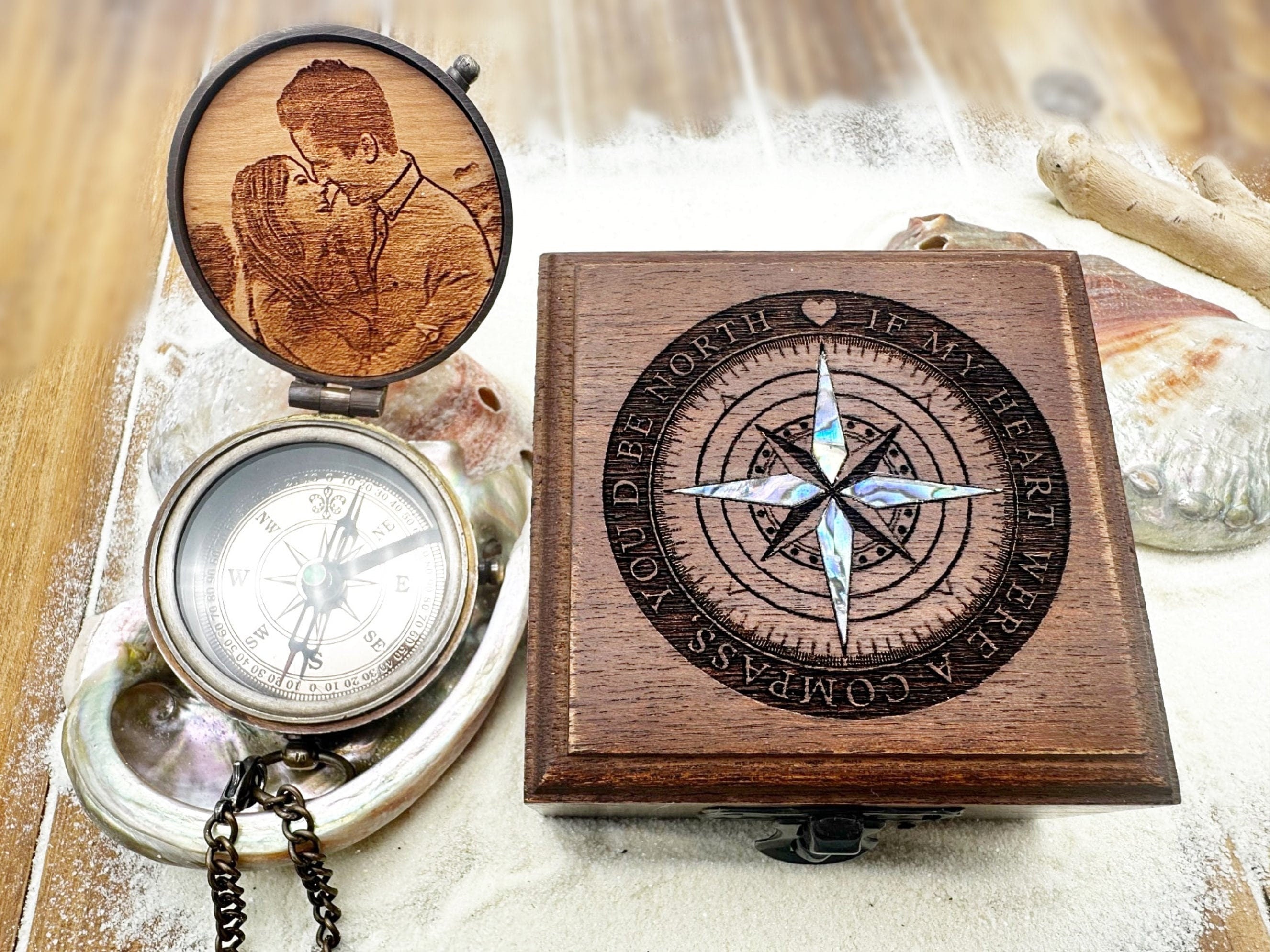 Looking for the perfect personalized birthday gift for him? Look no further than this exquisite brass compass, beautifully showcased in a shell inlay decorated wood box. This unique and thoughtful gift is sure to impress, as it combines the timeless charm of a compass with the intricate artistry of shell inlay. Engrave a special message or his initials to make this gift truly one-of-a-kind. Whether he's a traveler or simply appreciates fine craftsmanship, this personalized compass will serve as a cherished keepsake for years to come.
