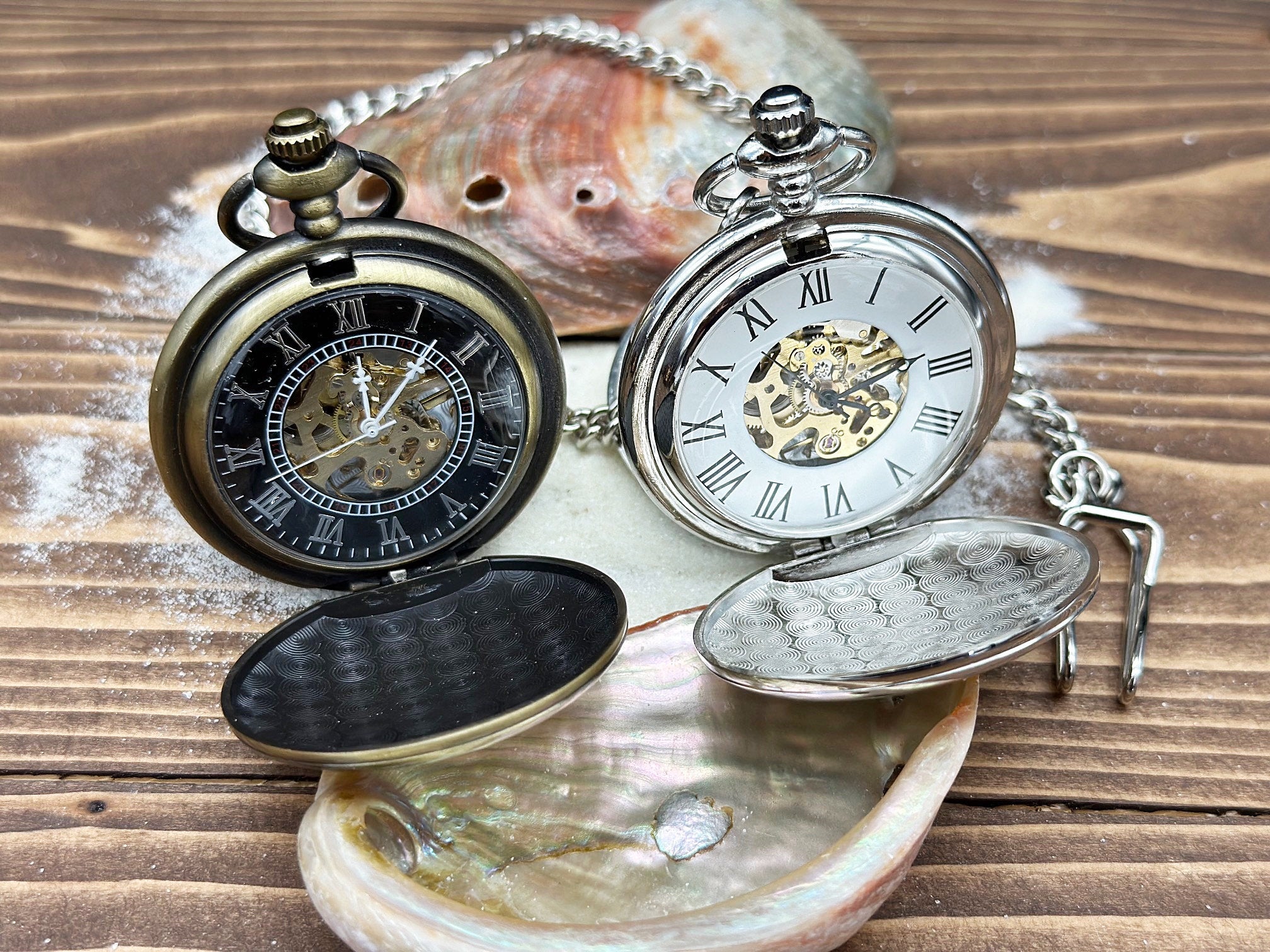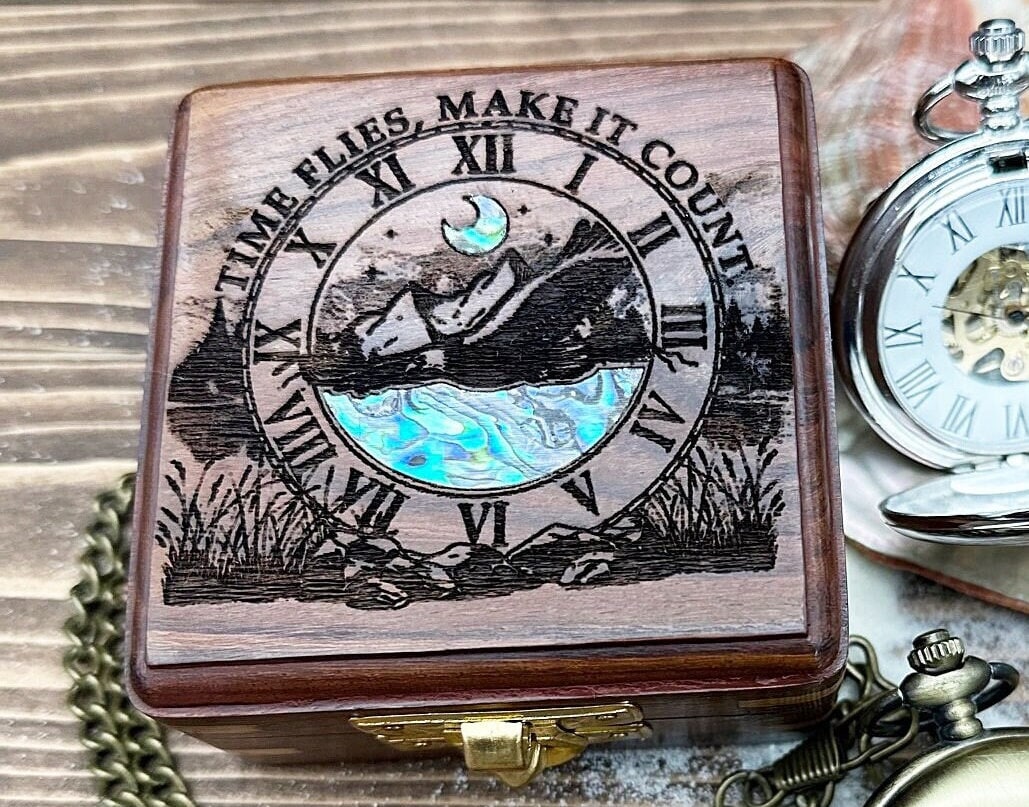 Introducing our stunning Personalized Engraved Pocket Watch with an exquisite Abalone Decorated Wooden Keepsake Box! This duo makes for an unforgettable Sentimental Gifts for Boyfriend, Best friend, Dad, or Brother that combines elegance, sentimentality, and functionality. The pocket watch boasts intricate engraving, unique to your personalization, ensuring that it becomes a cherished keepsake. Encased in a wooden box adorned with abalone decoration, it adds a touch of natural beauty to the overall presentation. This thoughtful gift is perfect for anniversaries, birthdays, graduations, or any special occasion. Your loved one will truly appreciate the timeless beauty and personal touch of this one-of-a-kind pocket watch shining brightly from within its stunning wooden keepsake box.