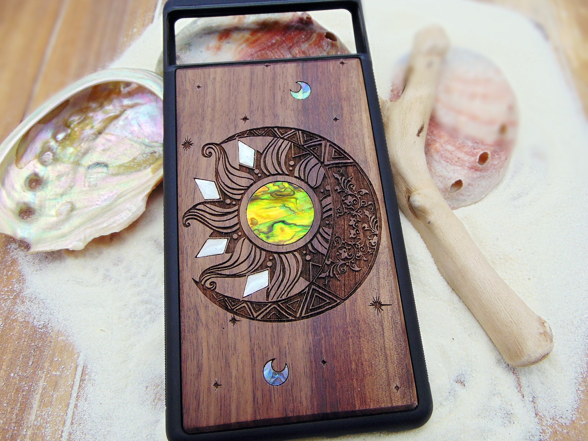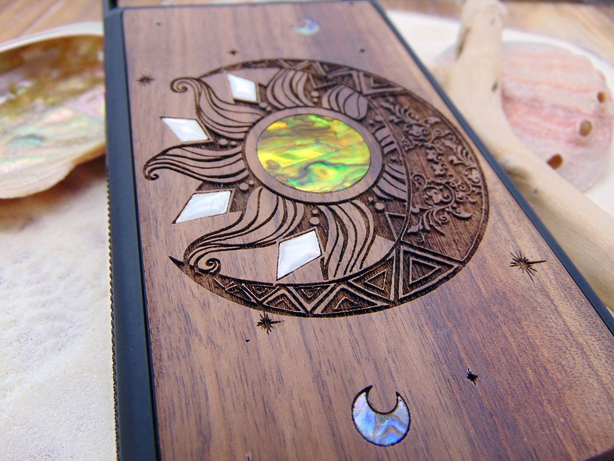 This Inlay iPhone case is made using Abalone shell. In old days this was done all by hand, nowadays we use a laser cutter to cut and engrave our wood and hand inlay the pieces.