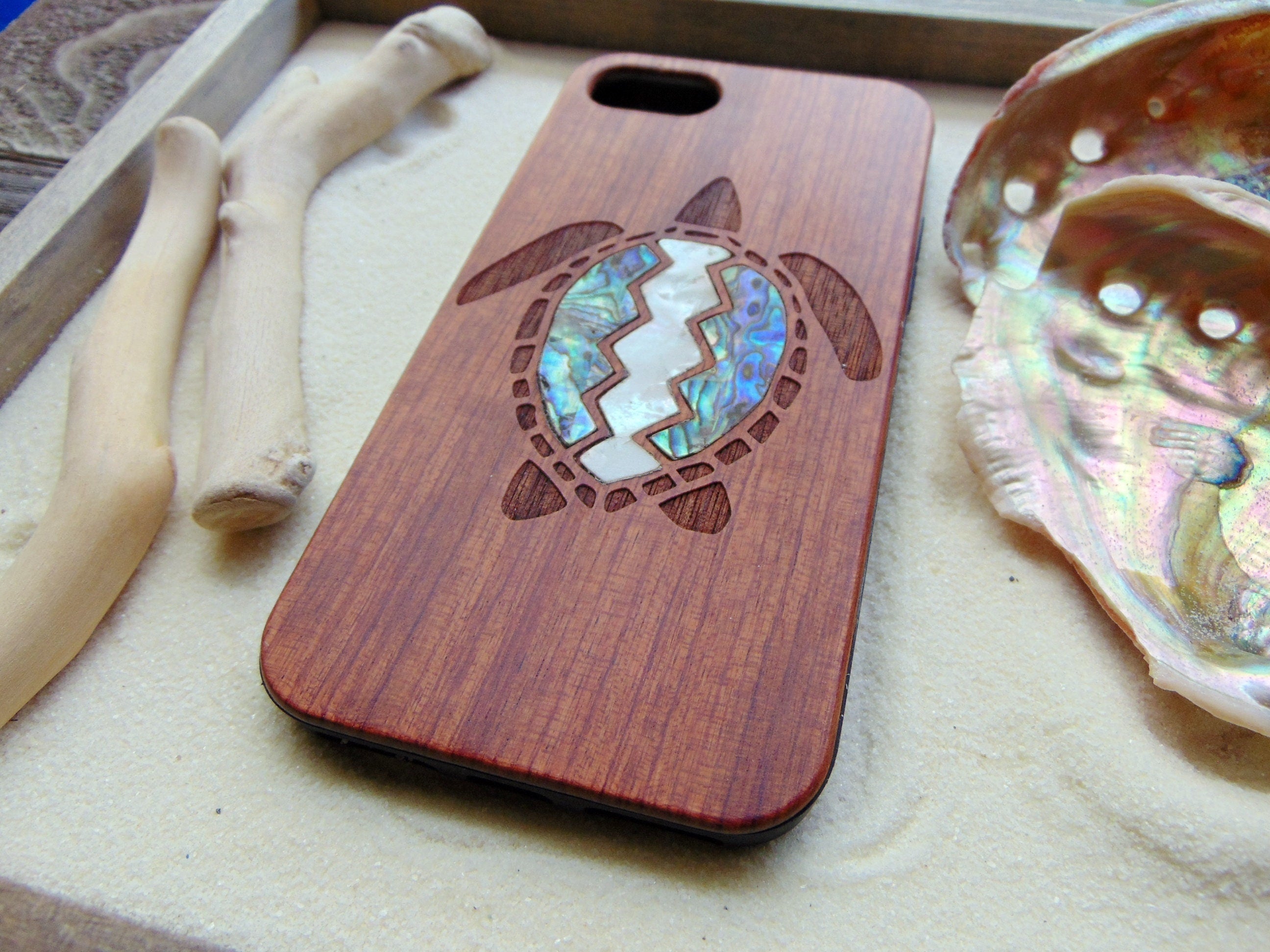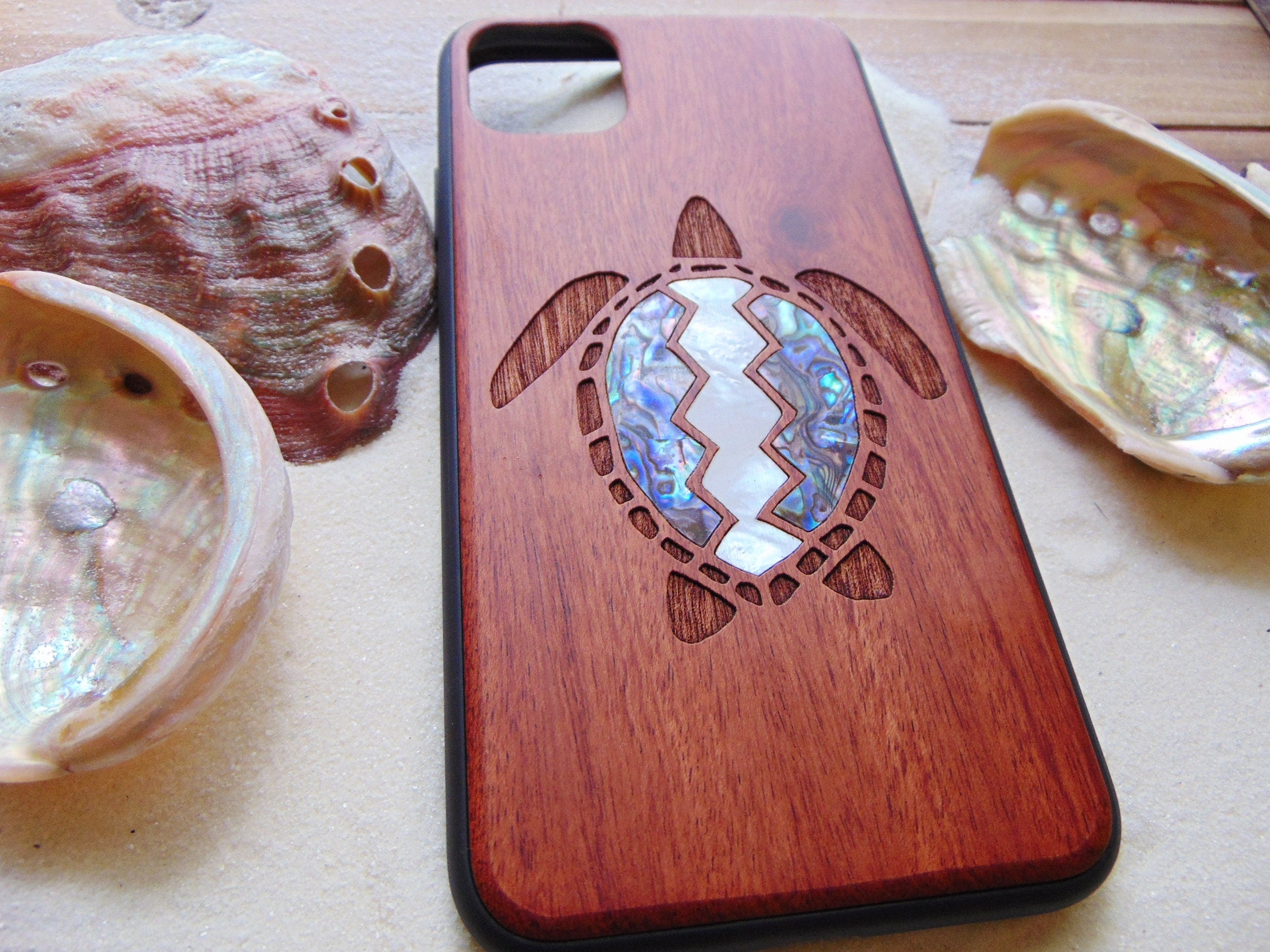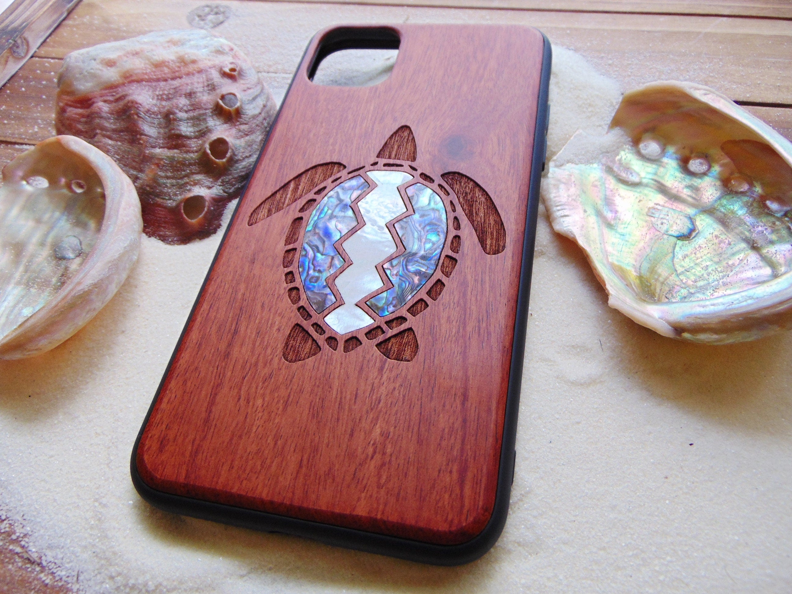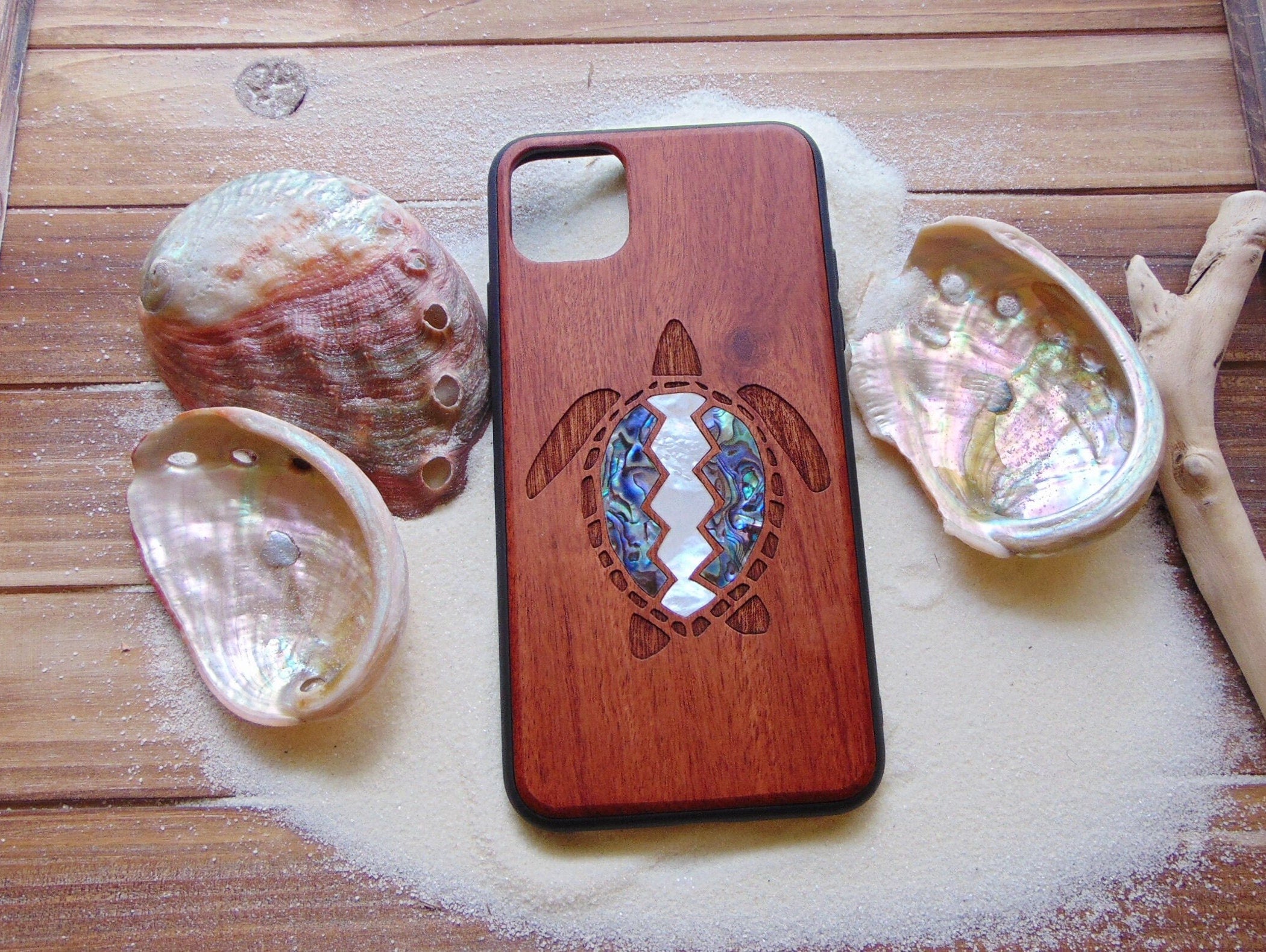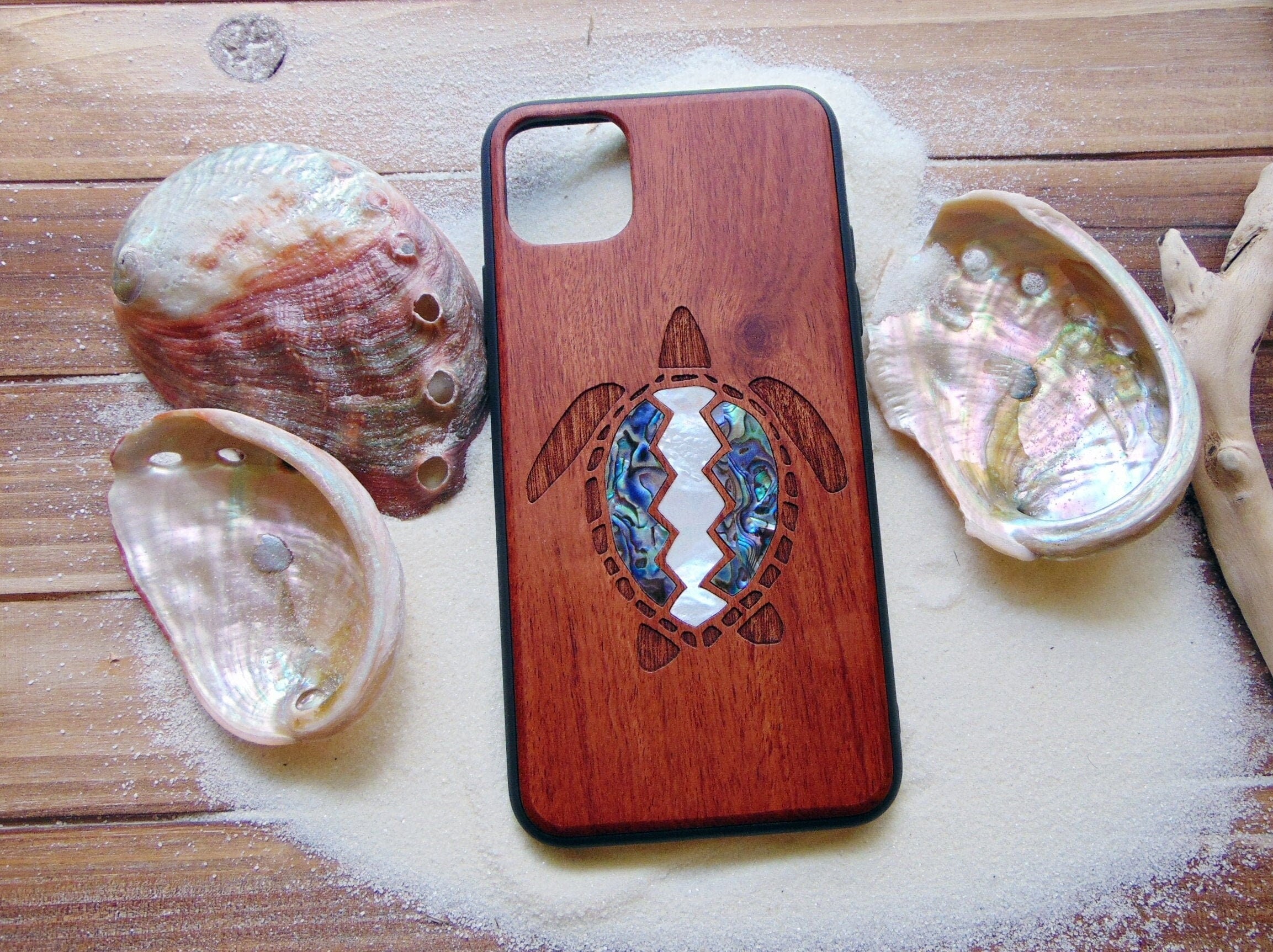 Phone case with sea turtle design is engraved on Cherry, Rosewood, and black painted bamboo wood using Abalone inlay. It can be personalized with your writing, name, etc. at no extra cost.