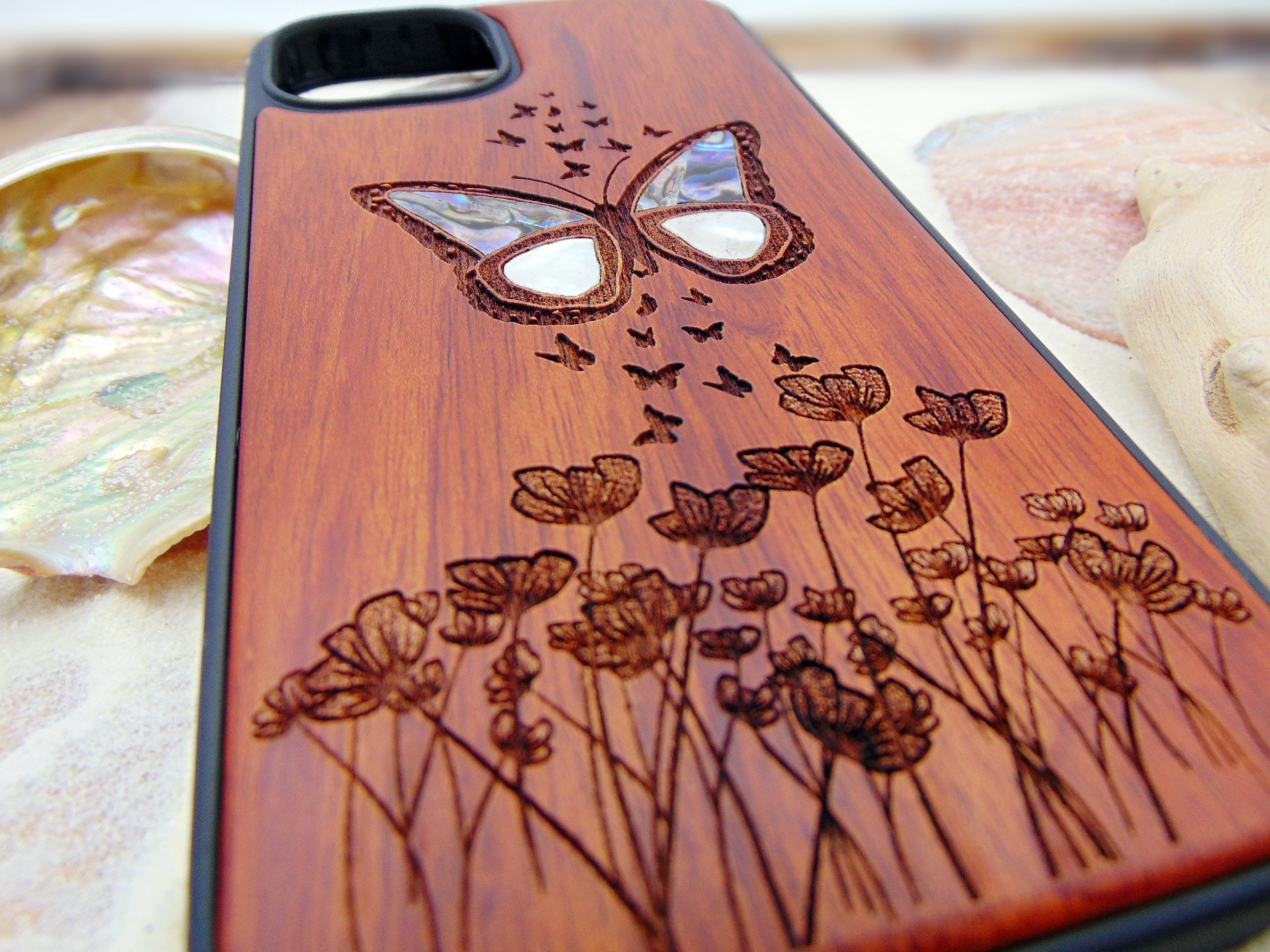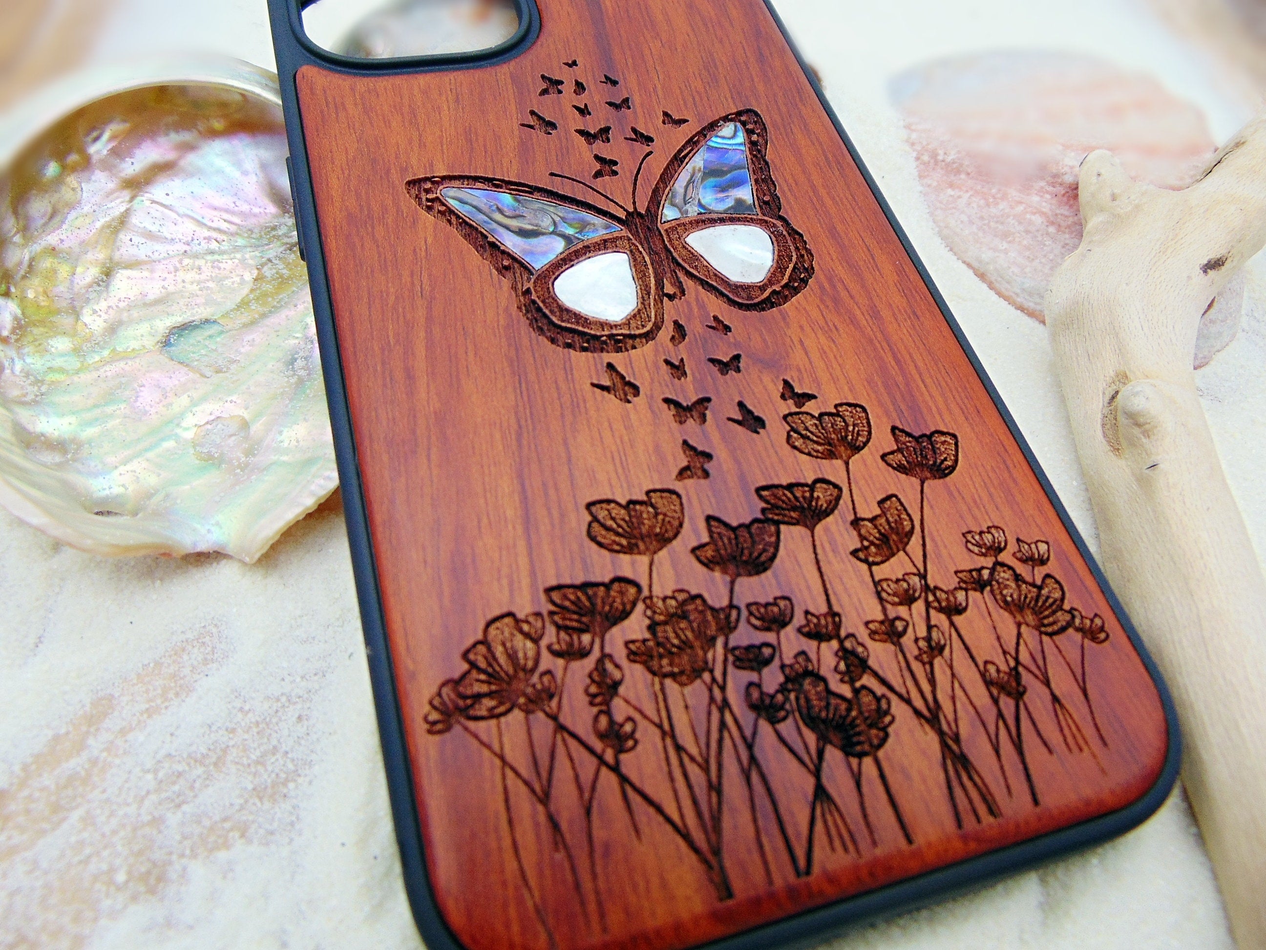 Inserting Mother of Pearl or Abalone shell into the surface of an object (Wood in this case) is called an inlay. In old days this was done all by hand, nowadays we use a laser cutter to cut and engrave our wood and hand inlay the pieces.