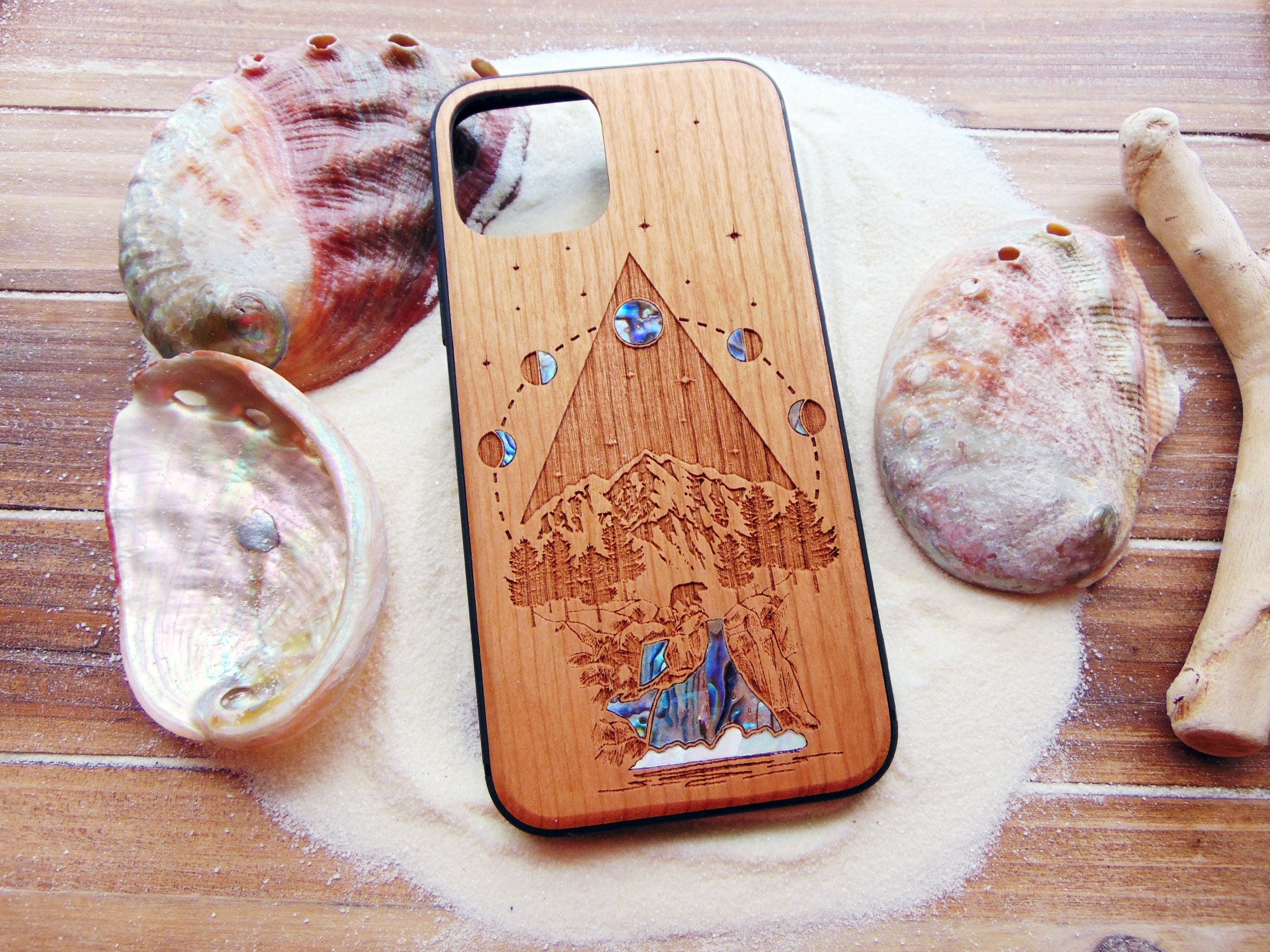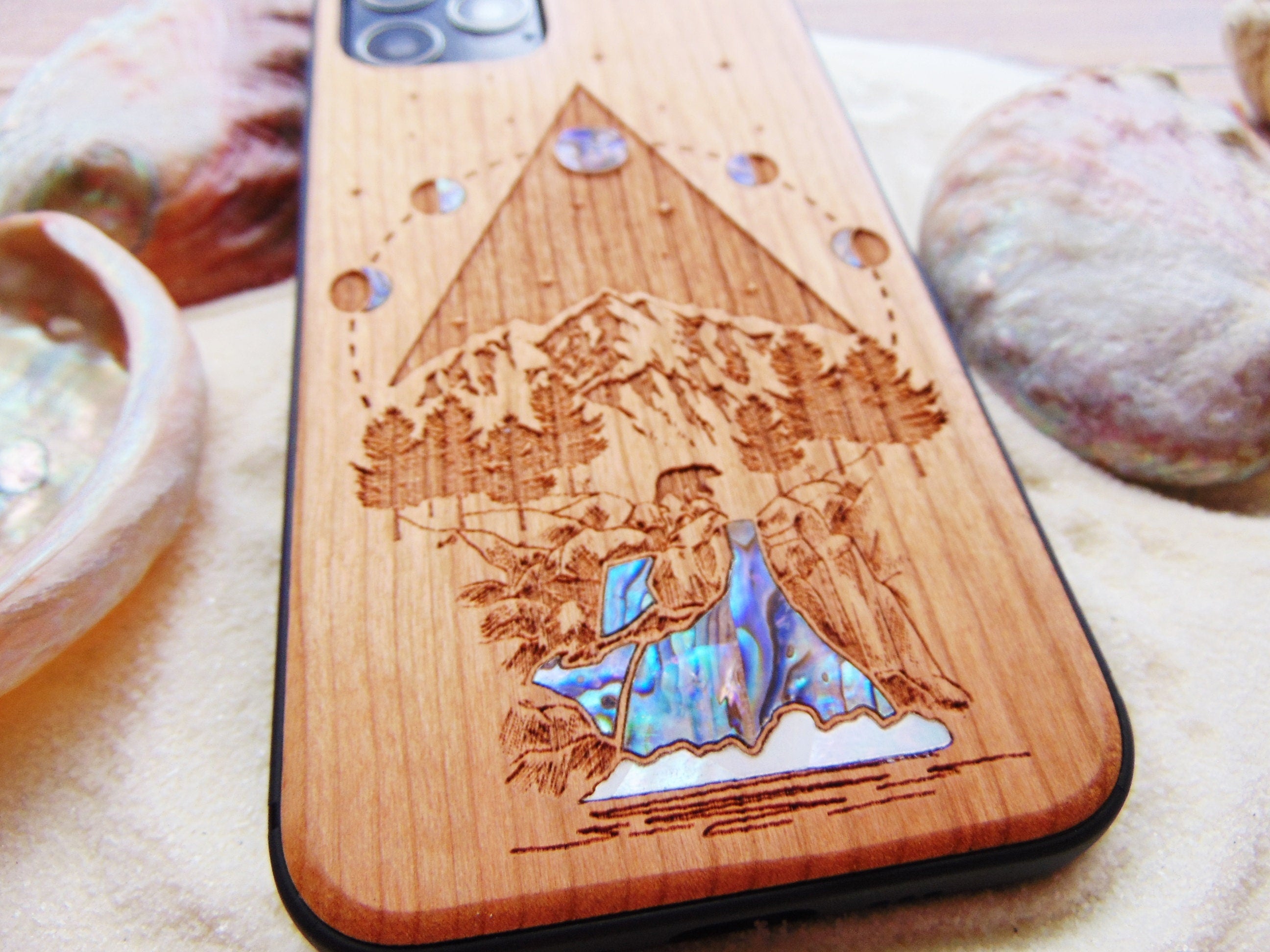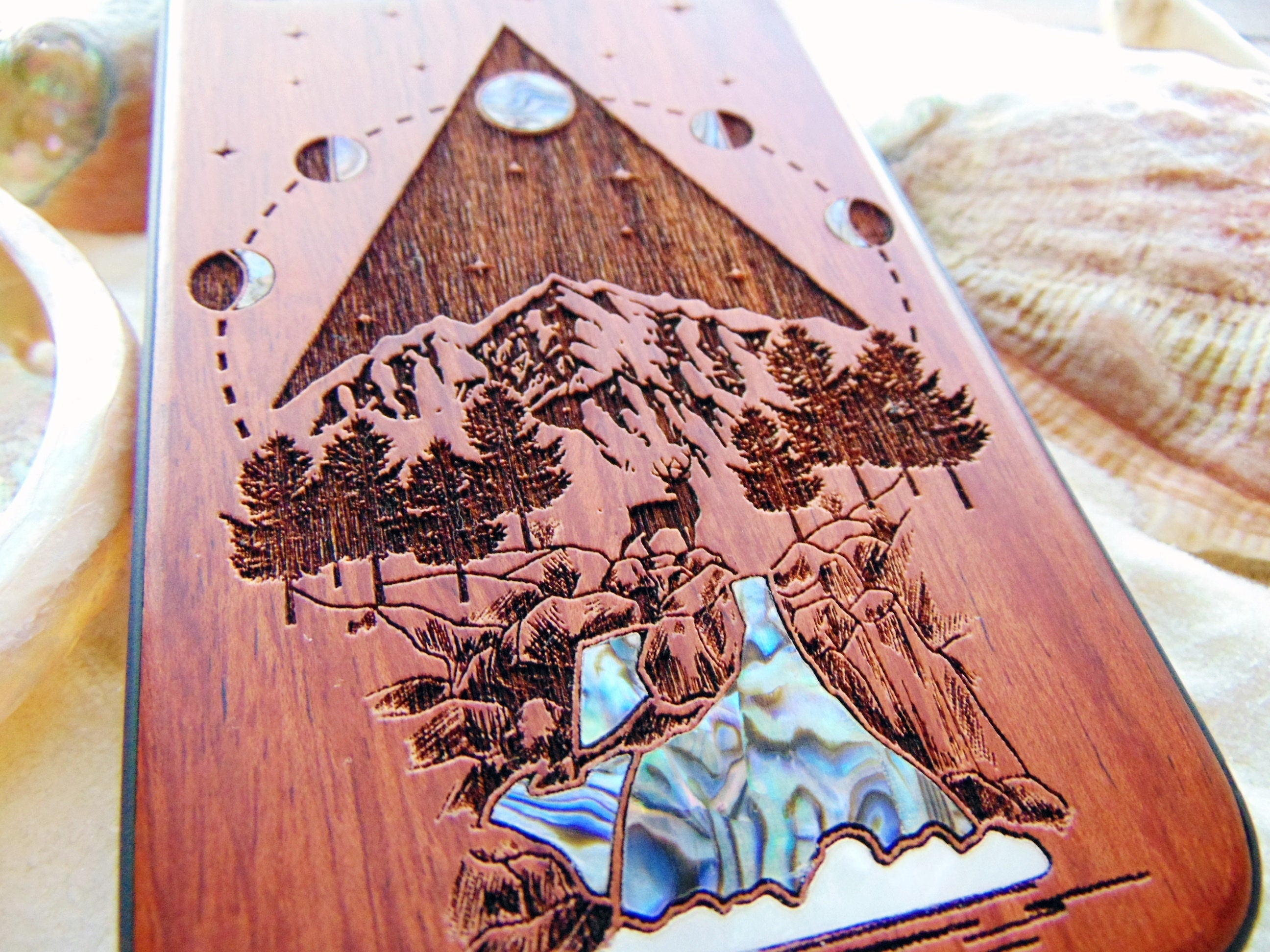 Wooden phone case with Mother of Pearl/Abalone shell inlay on Rosewood phone case. Looks also great on cherry wood.