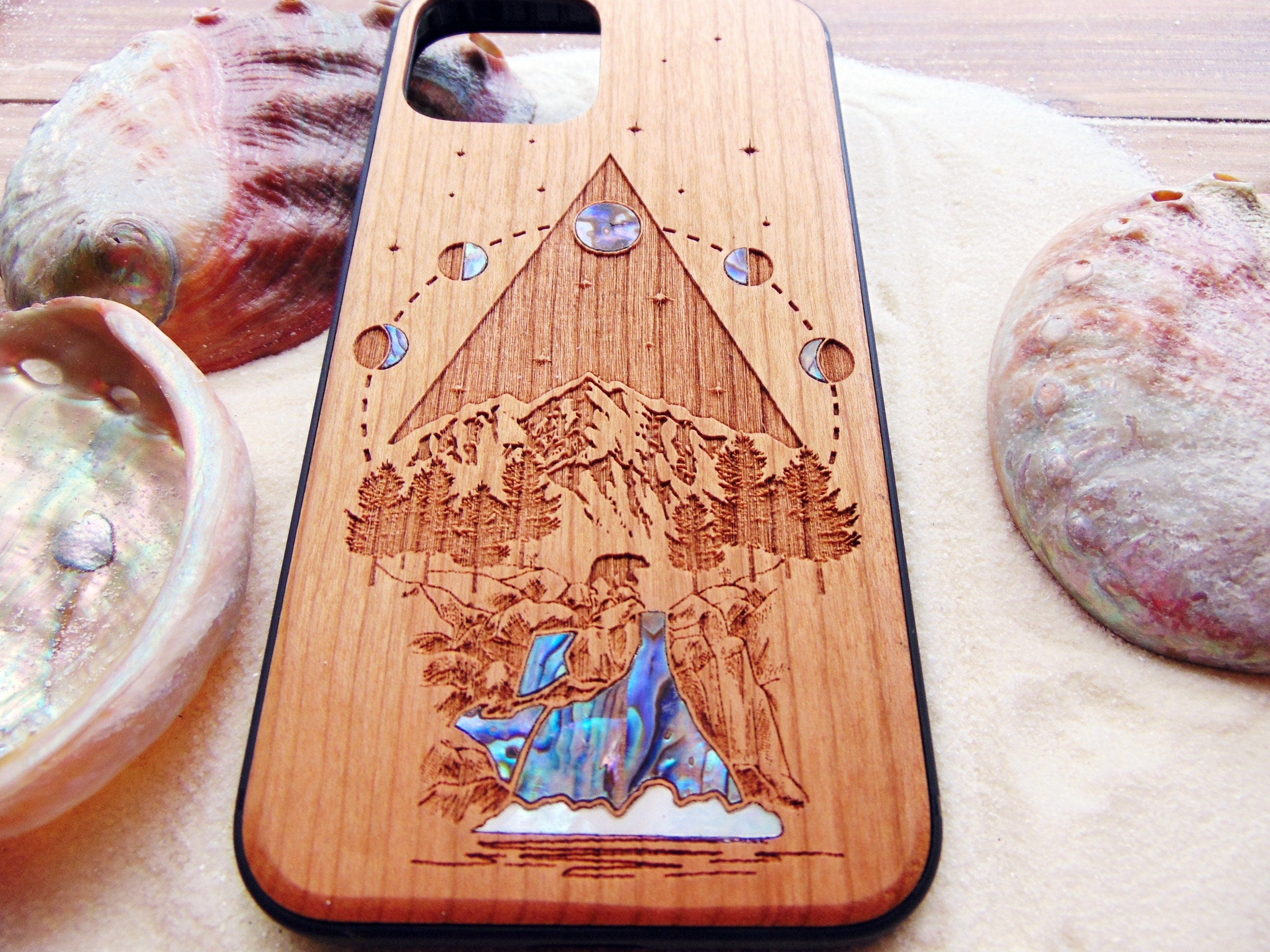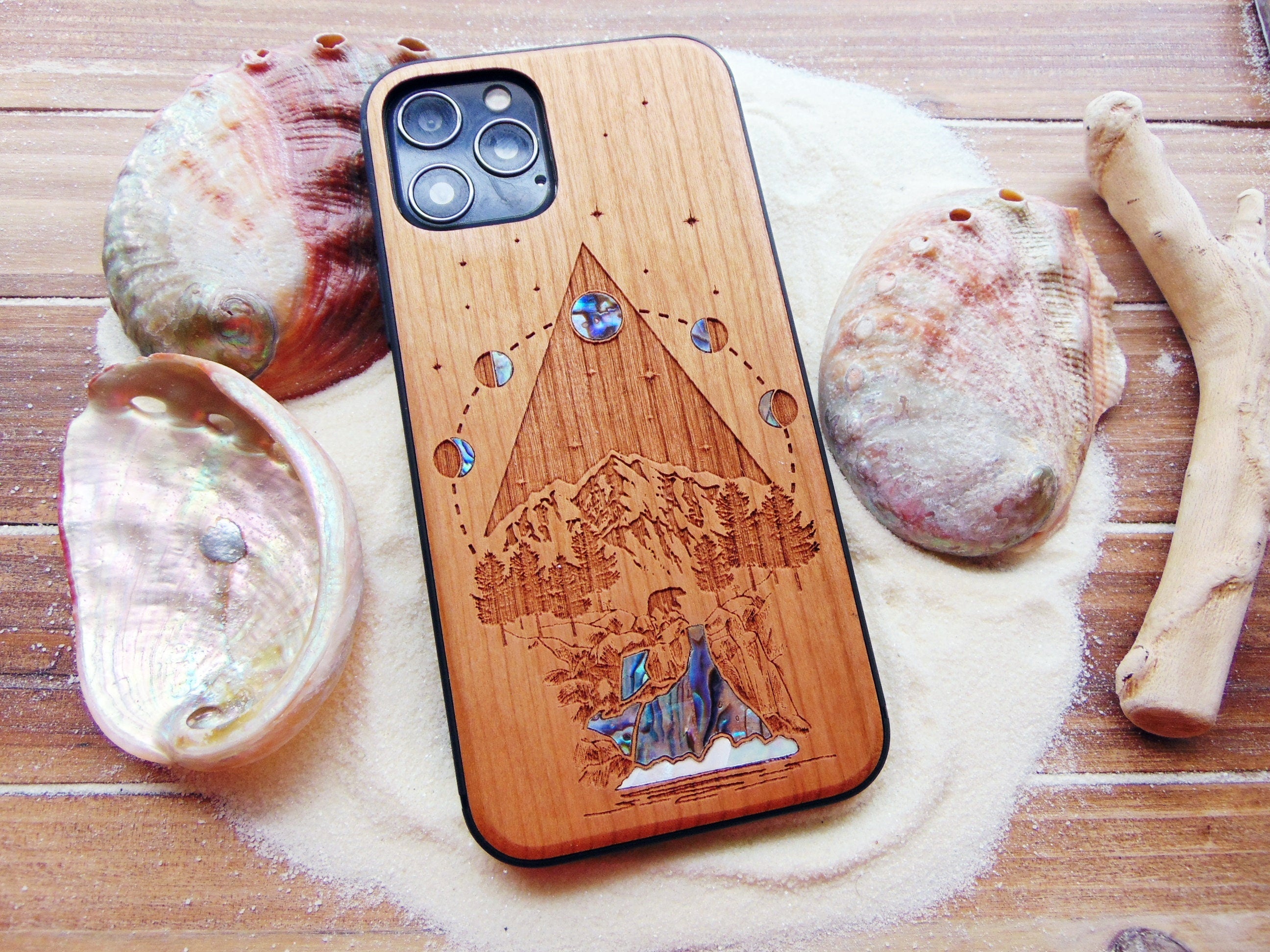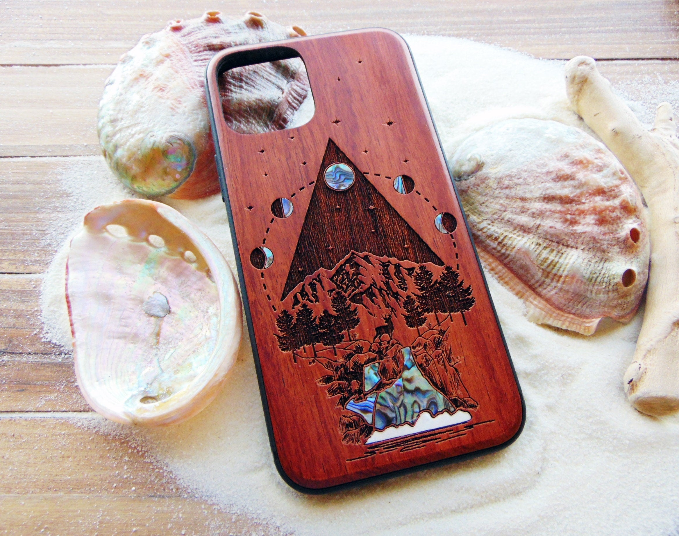 Wooden phone case with Mother of Pearl/Abalone shell inlay on Rosewood phone case. Looks also great on cherry wood.
