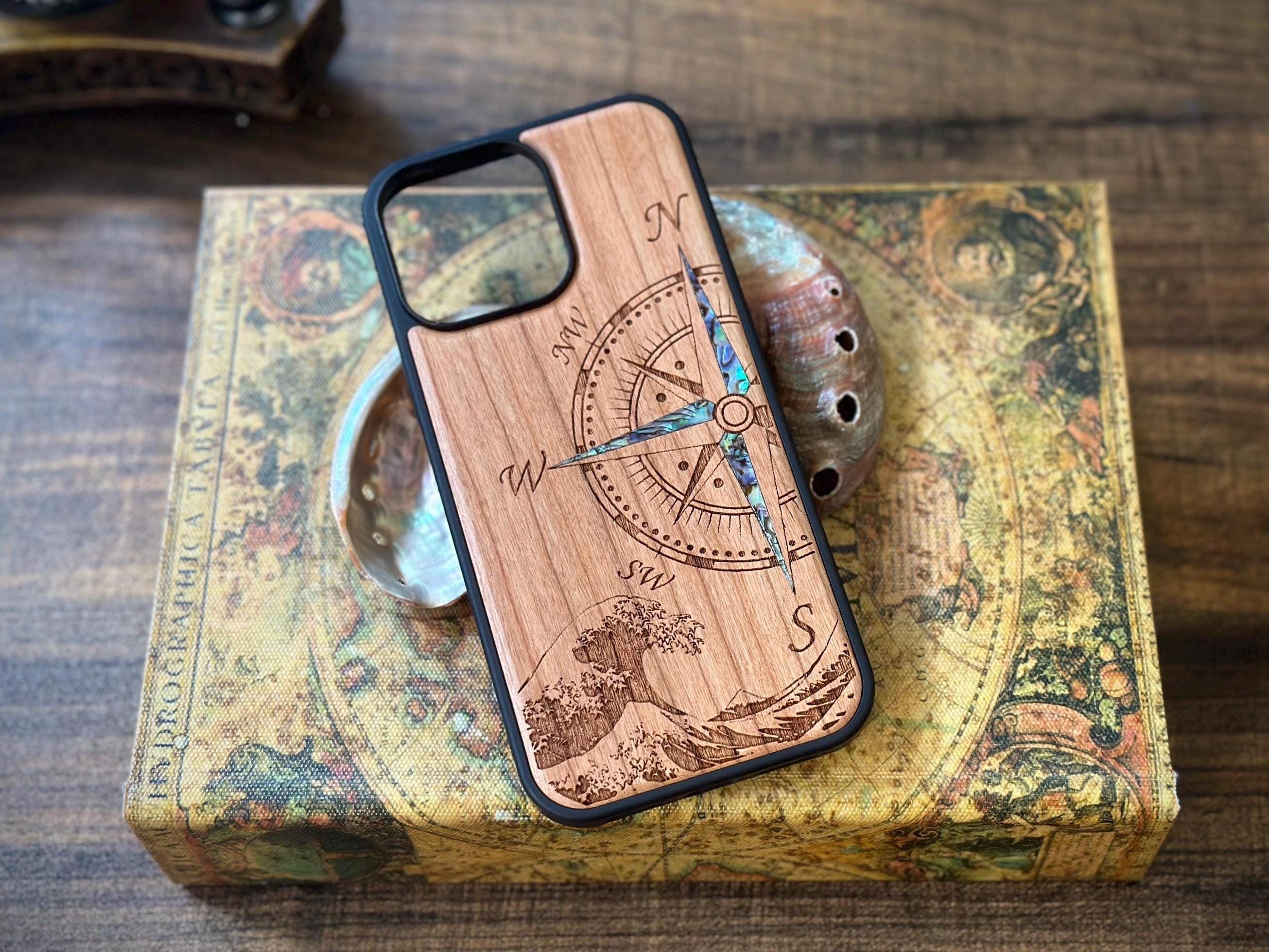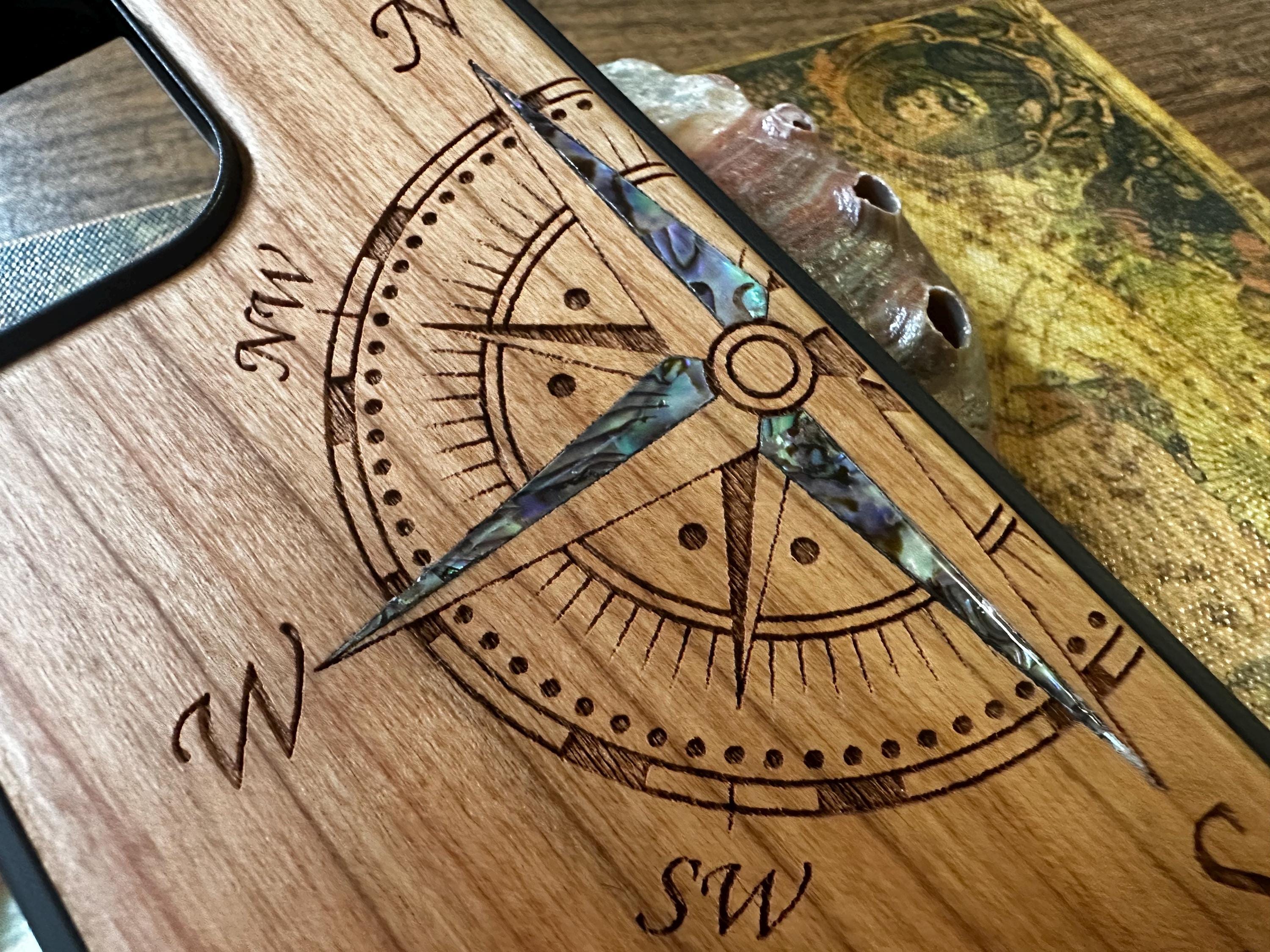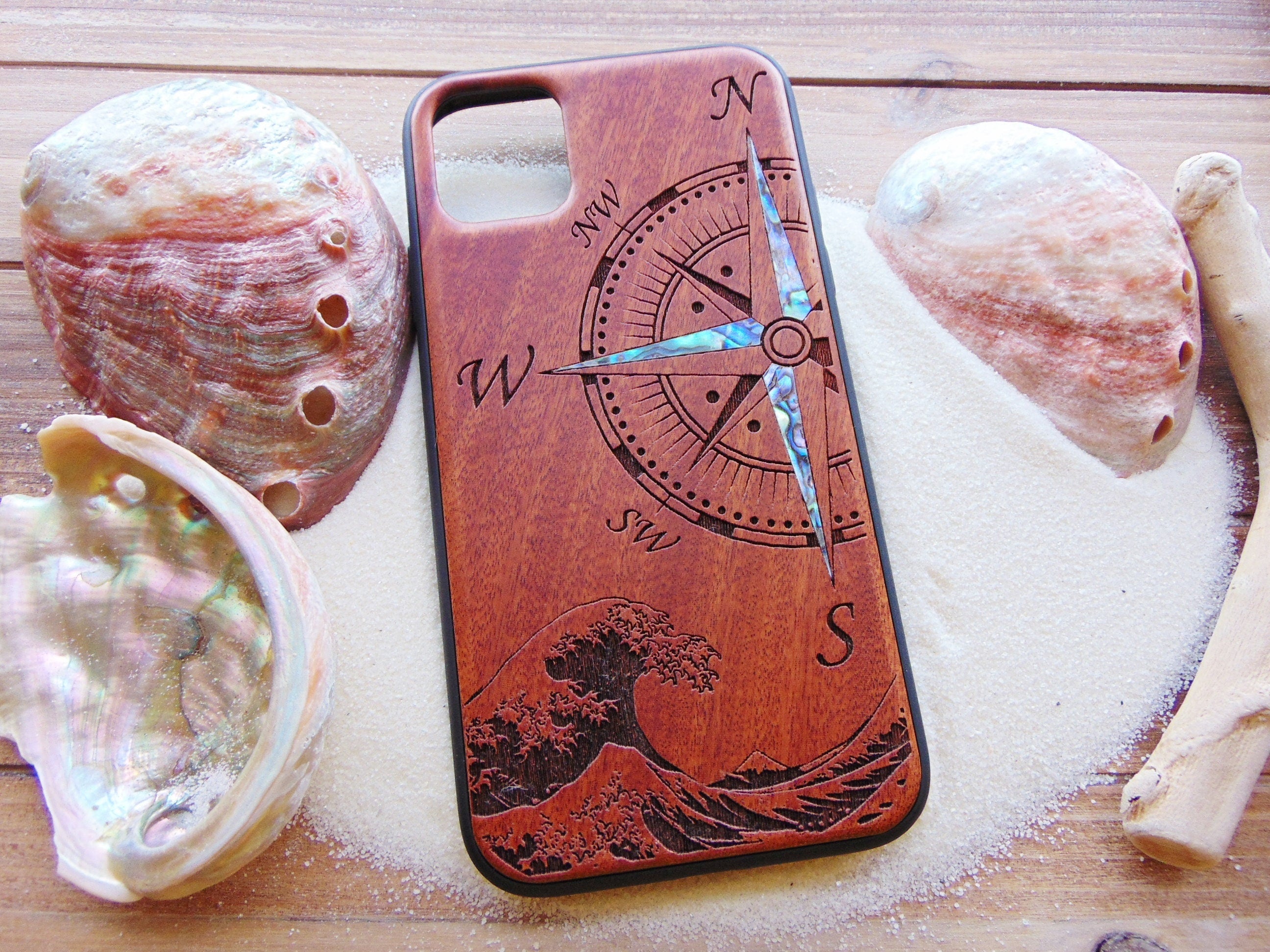 iPhone case with Compass design is engraved with natural Abalone/Mother of pearl shell inlay. It can be personalized with your writing, name, etc. at no extra cost.