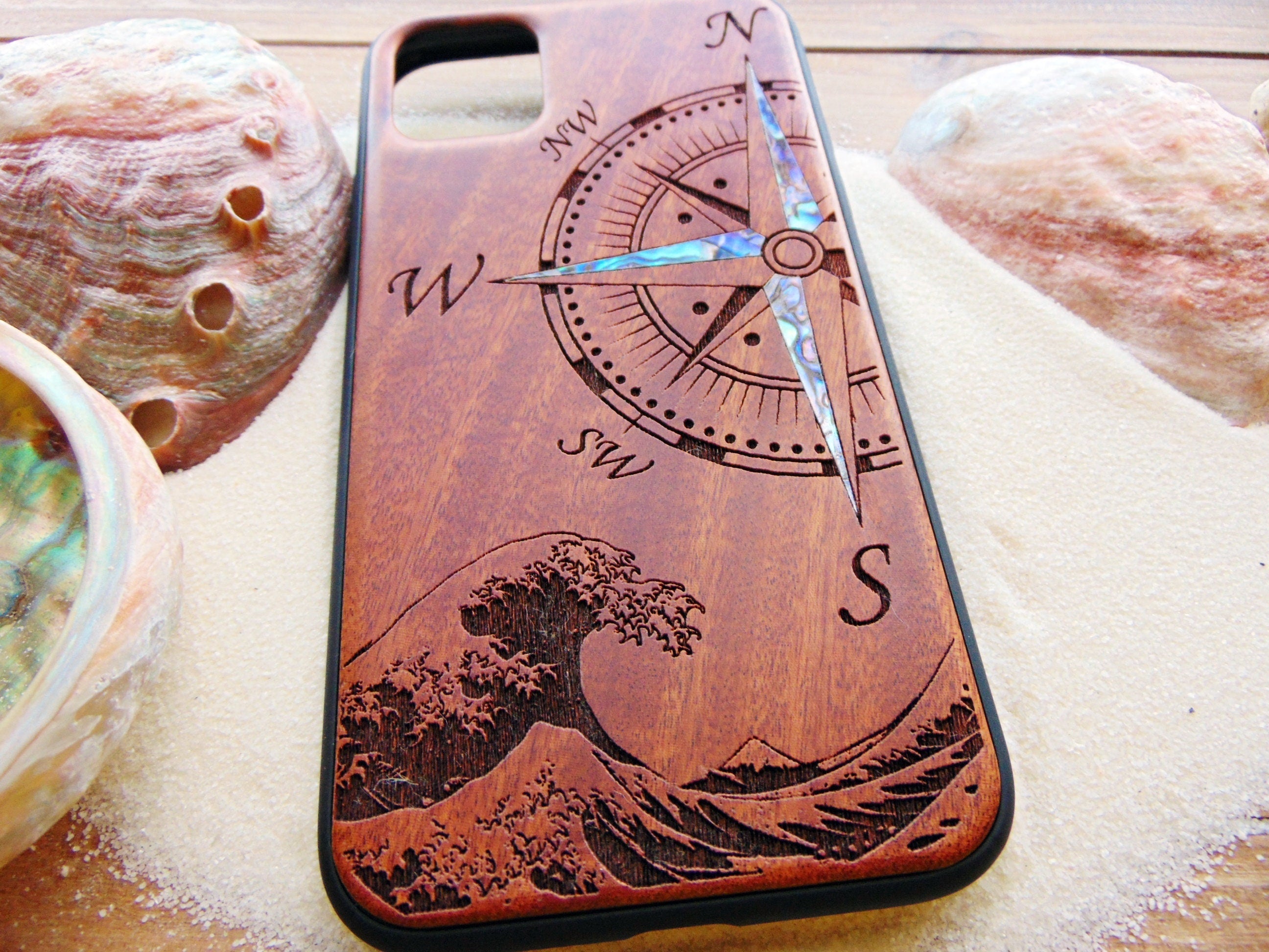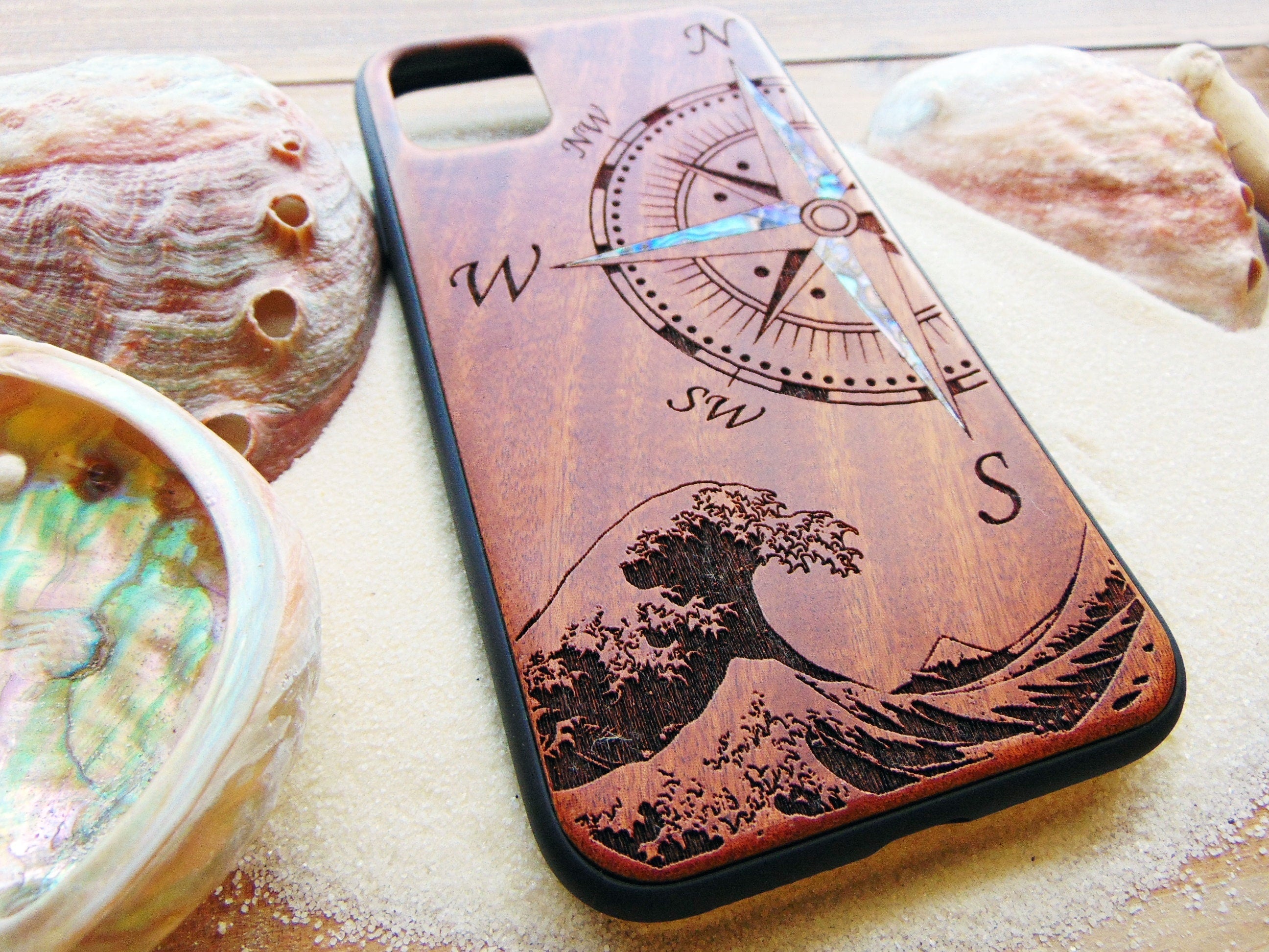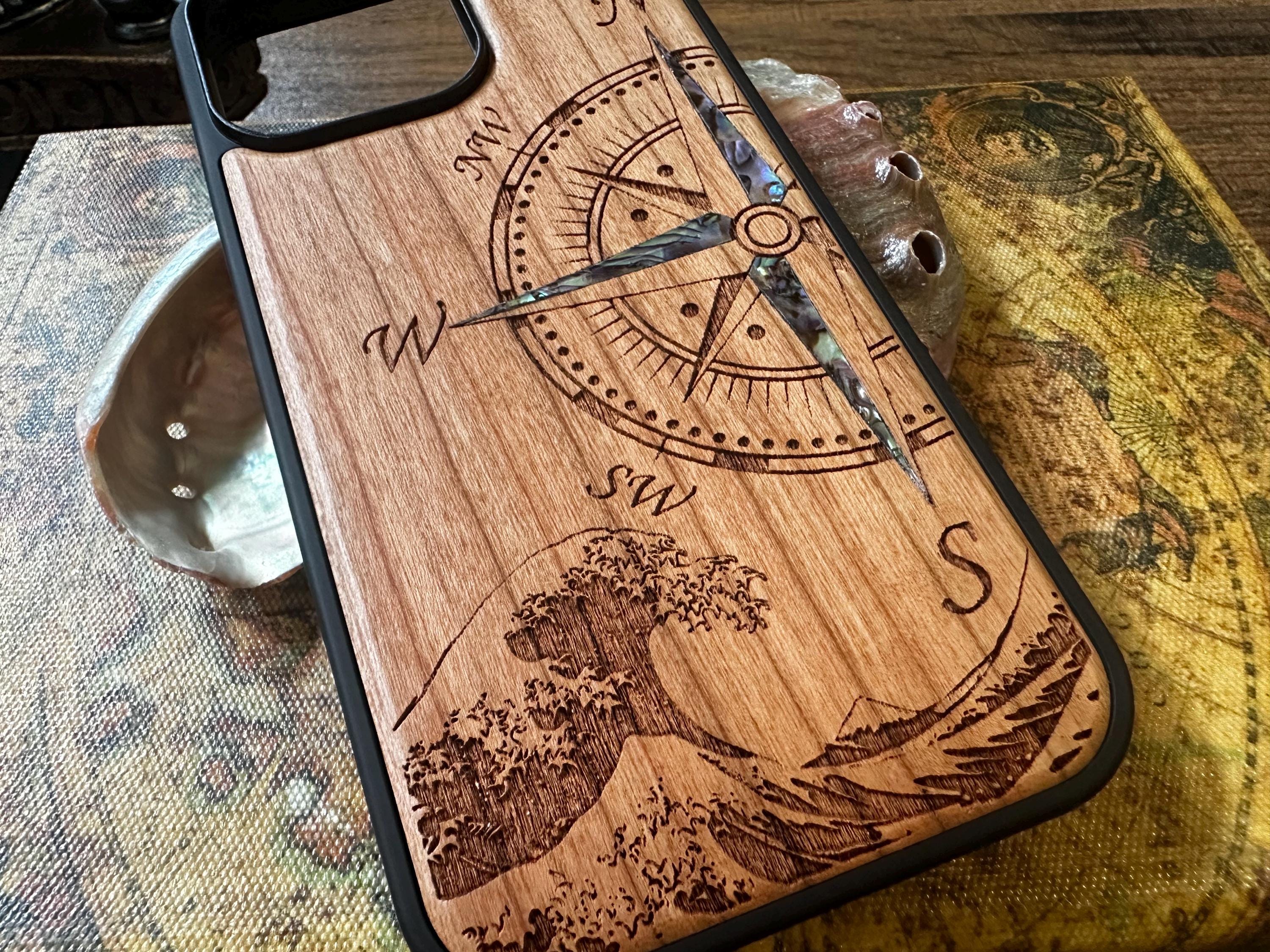 iPhone case with Compass design is engraved with natural Abalone/Mother of pearl shell inlay. It can be personalized with your writing, name, etc. at no extra cost.