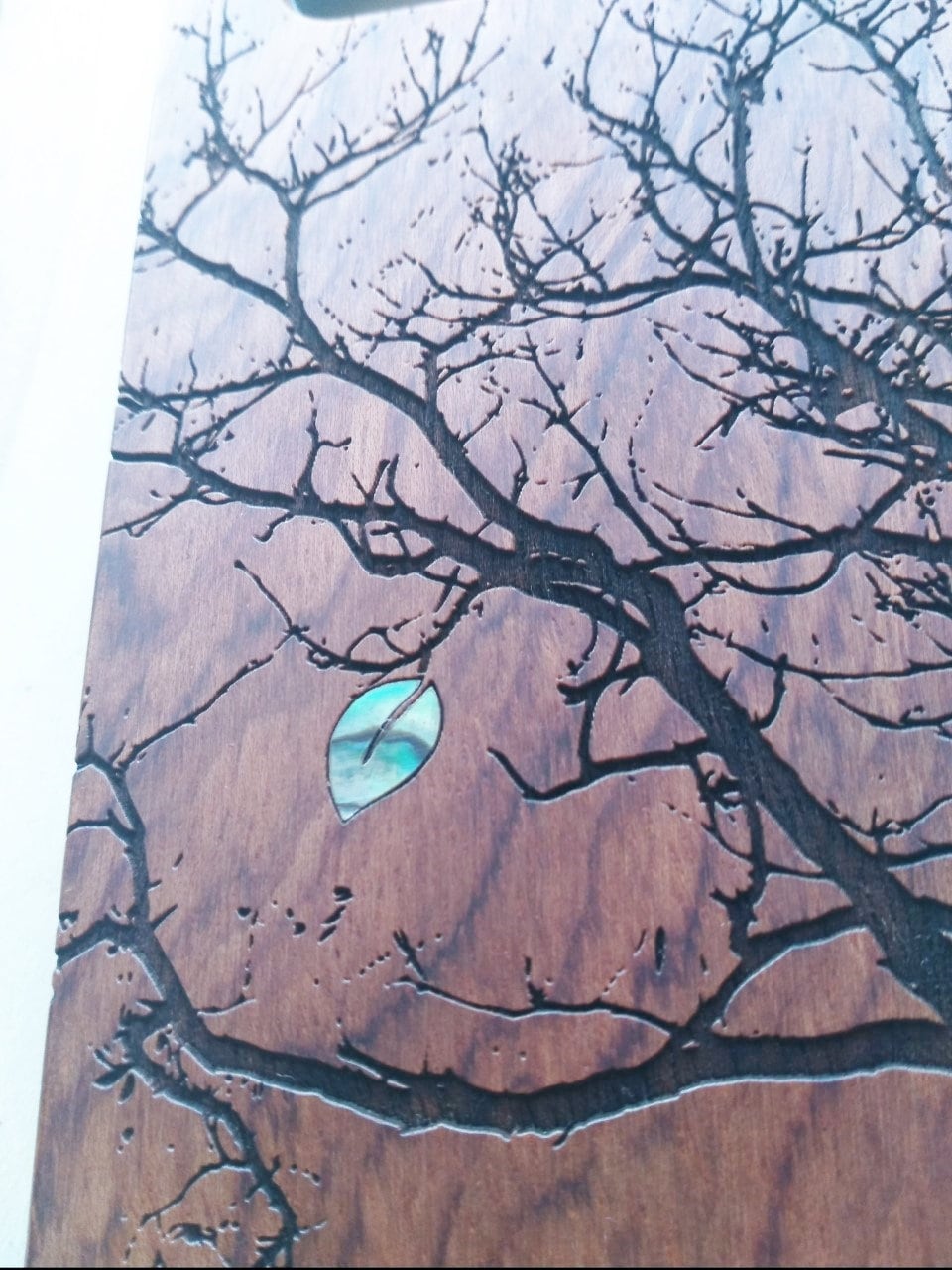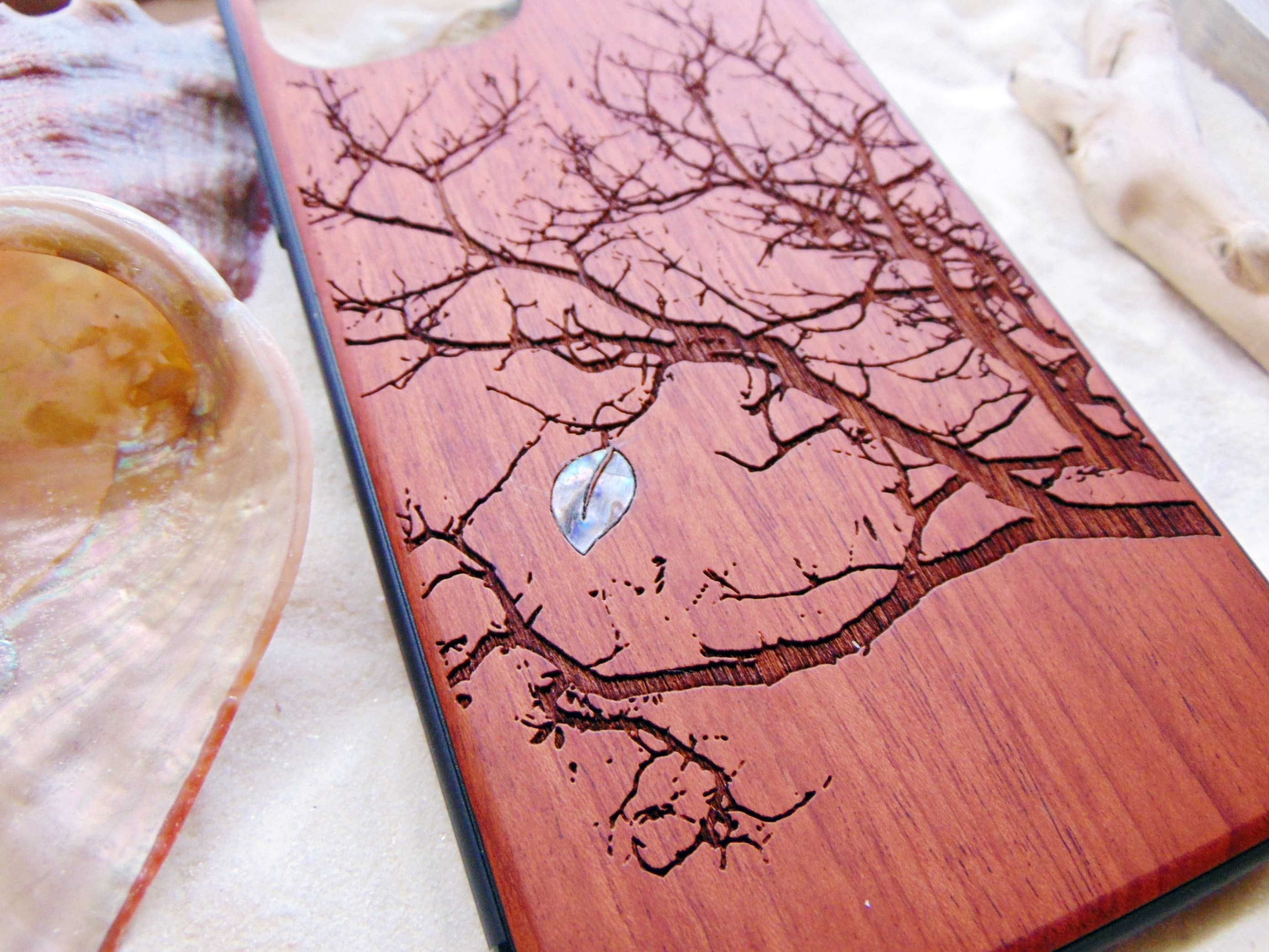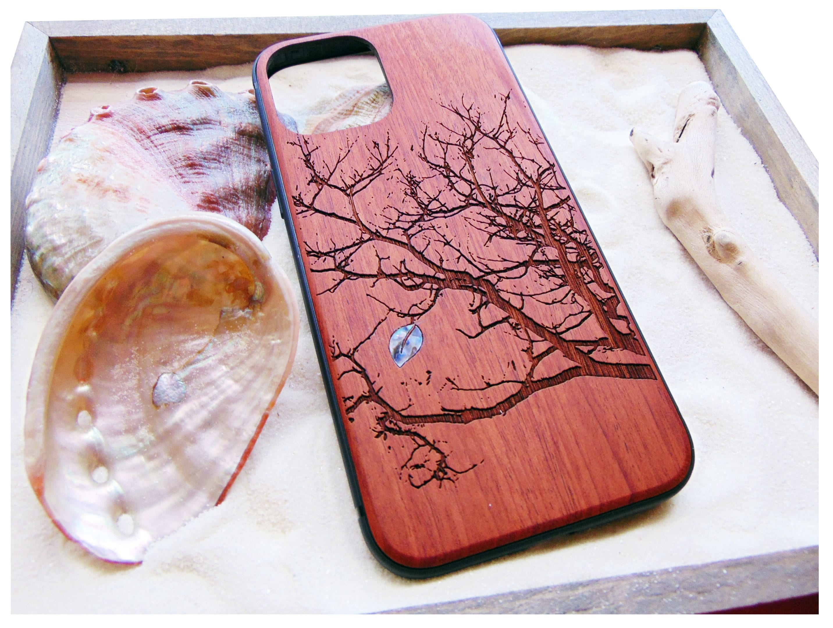 Phone case with tree design is engraved on Cherry wood, rosewood, and black painted bamboo wood using Abalone inlay. It can be personalized with your writing, name, etc. with no extra cost.