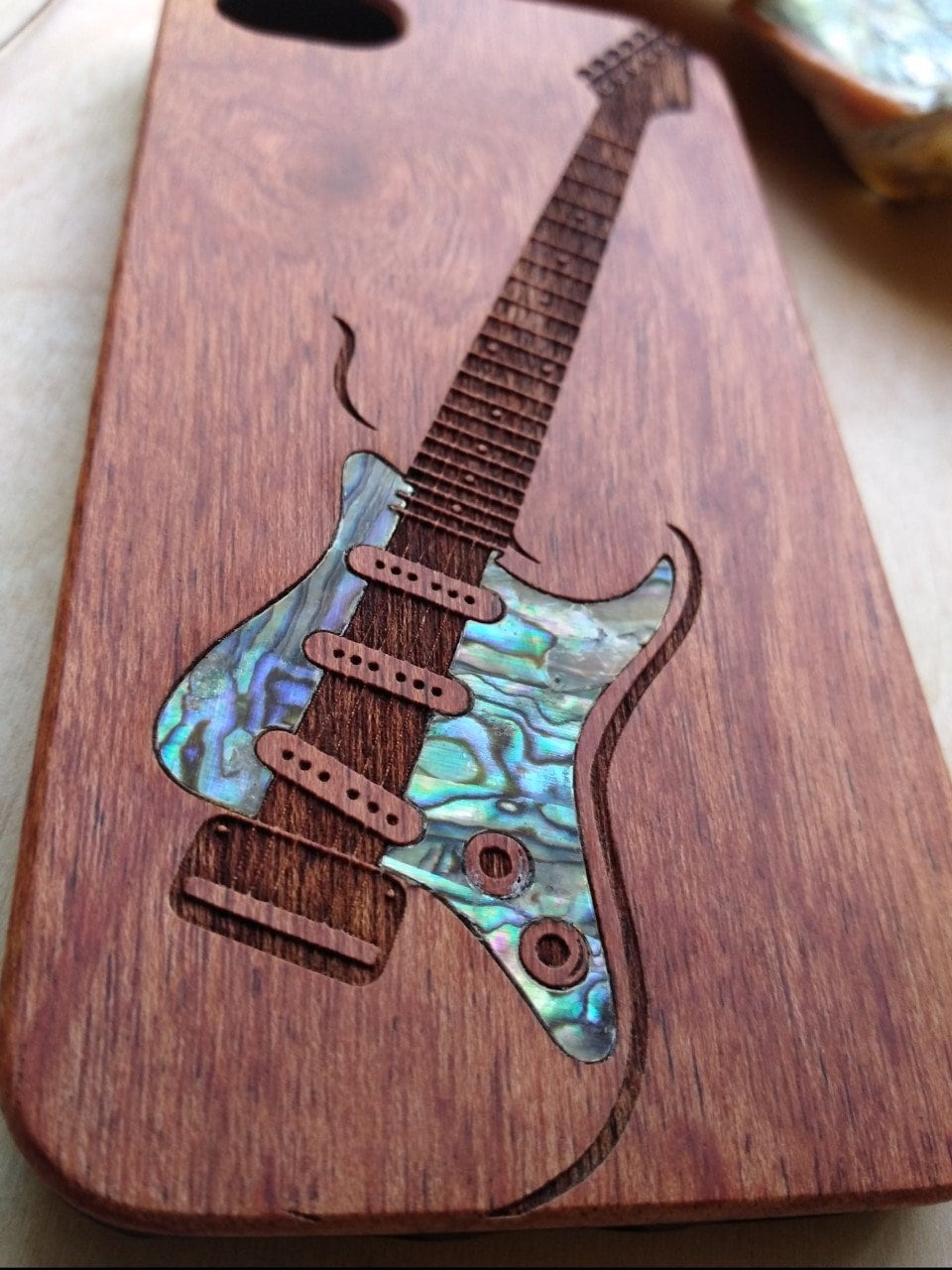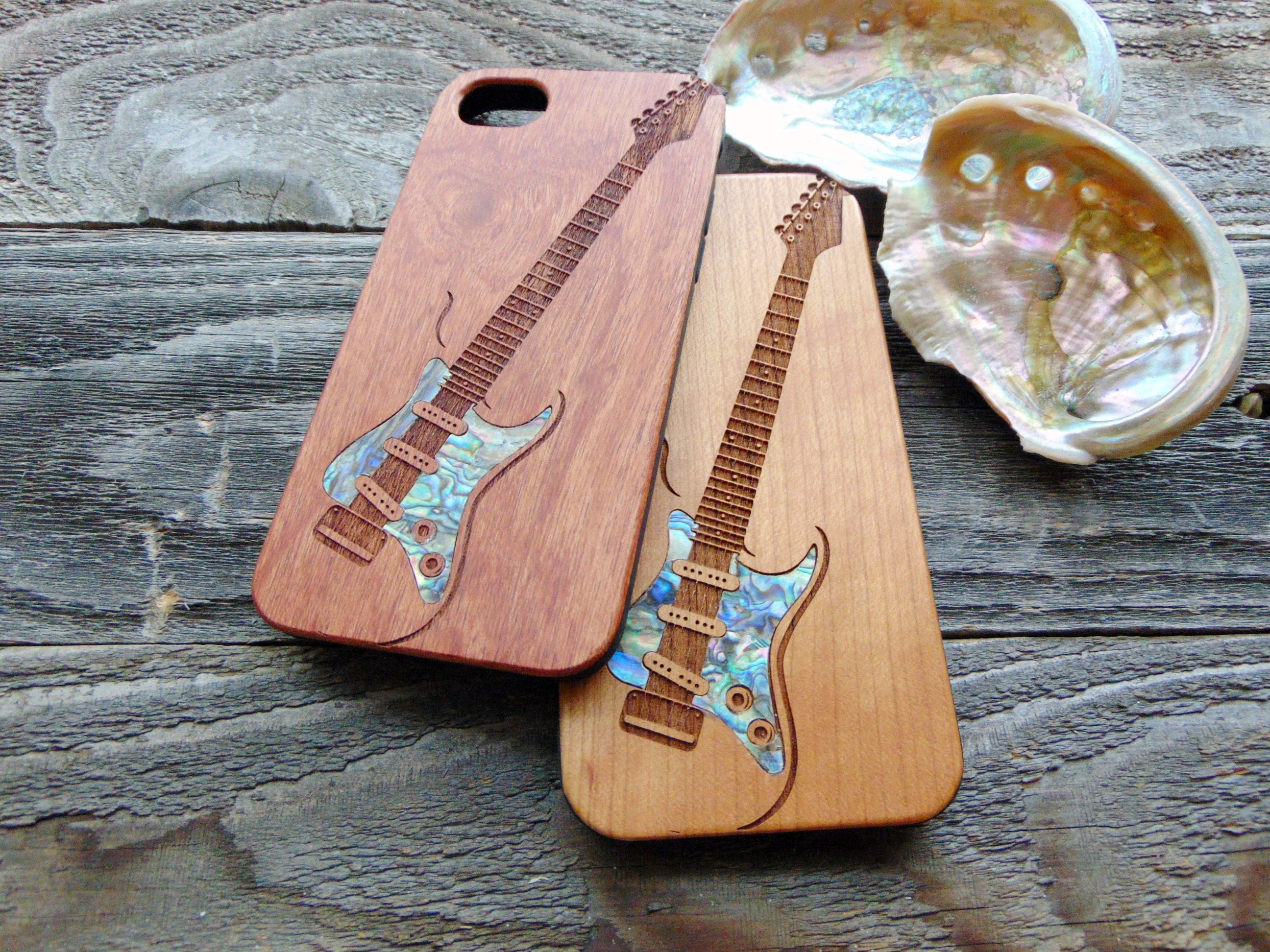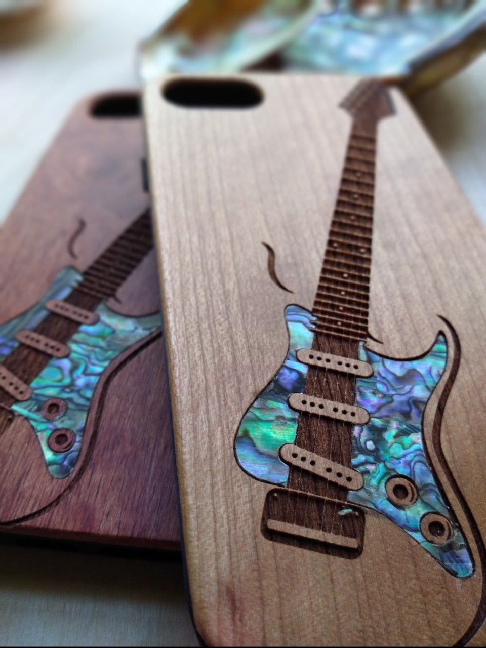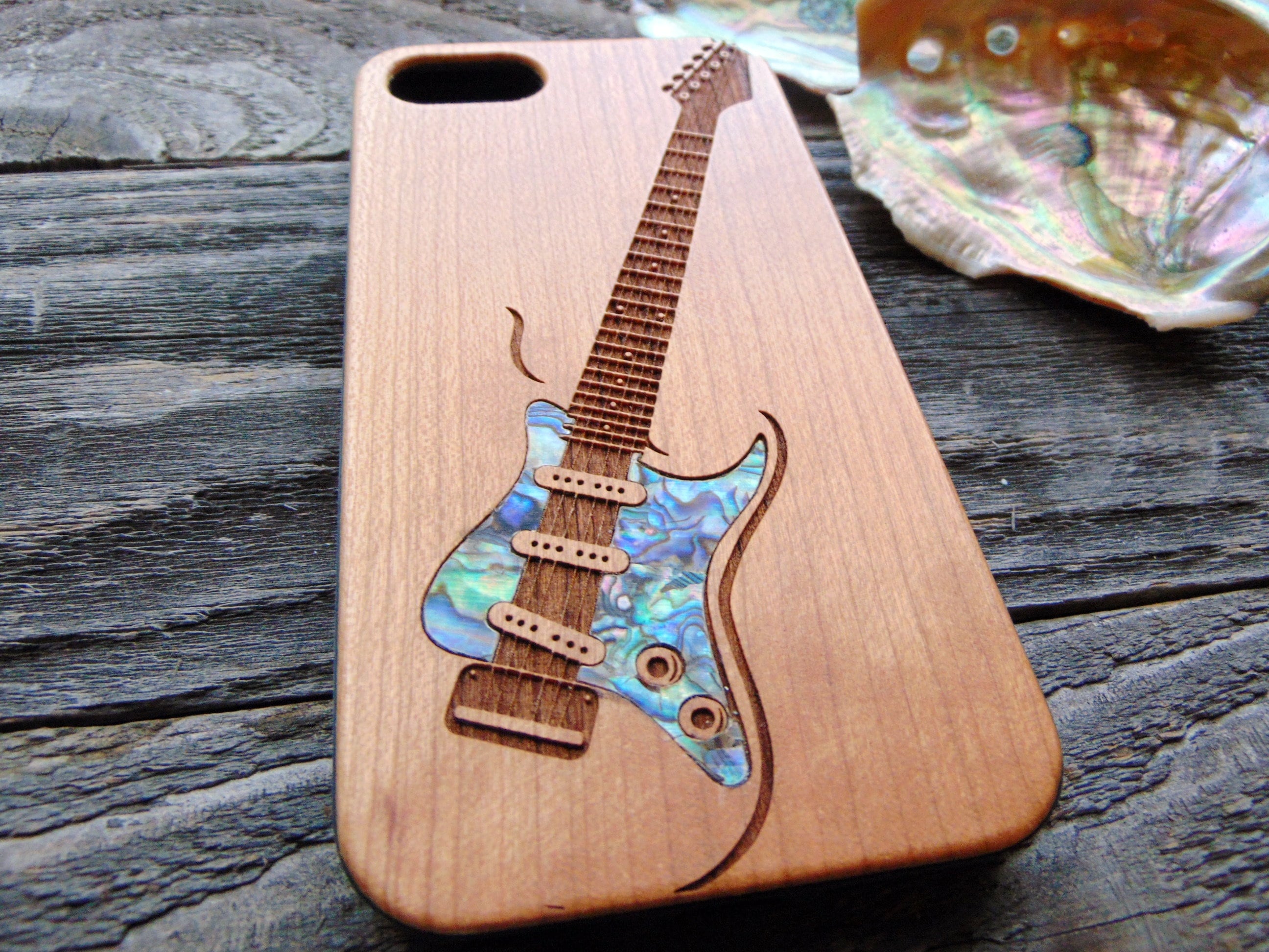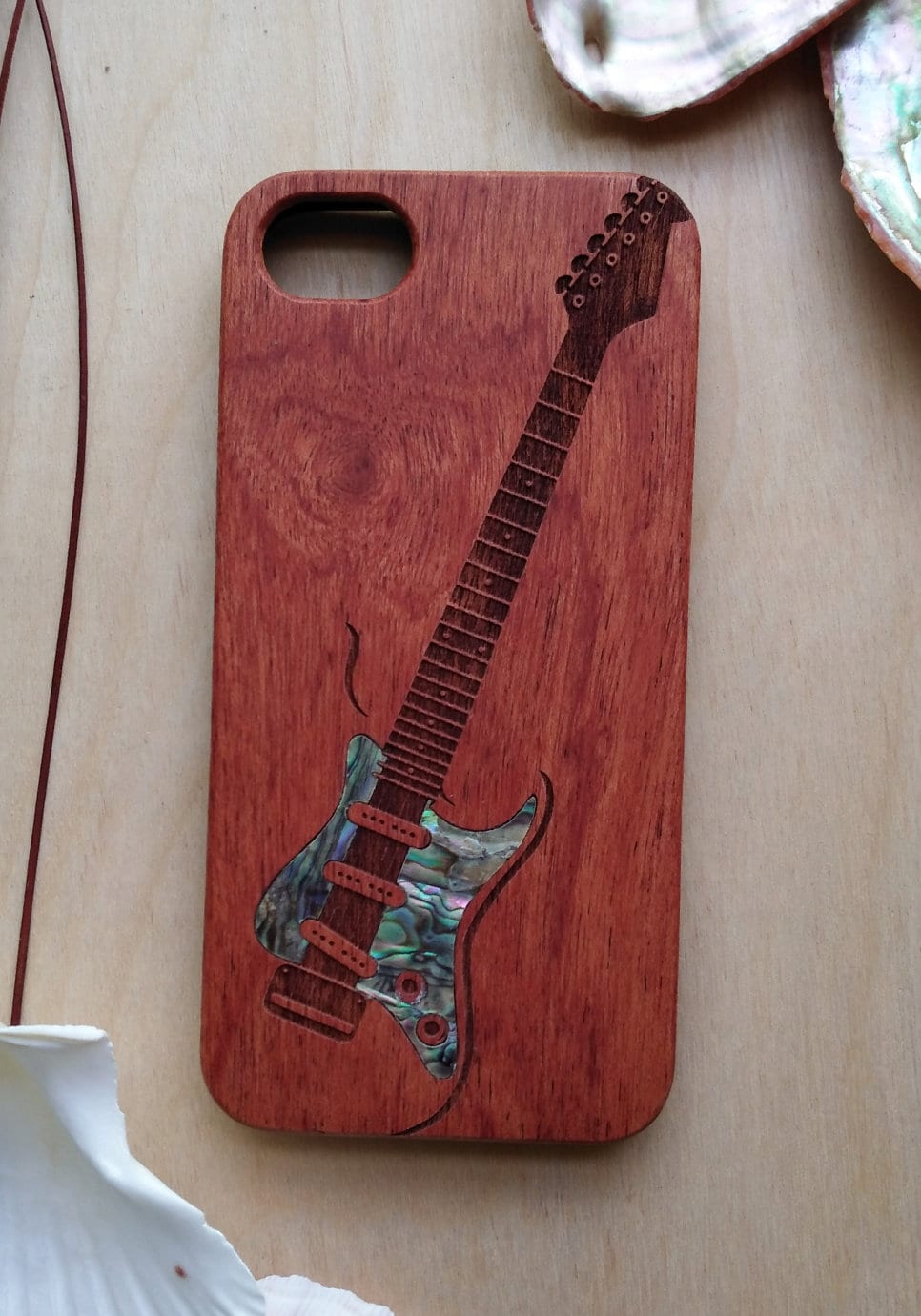 Phone case with guitar design is engraved on Cherry, Rosewood. It can be personalized with your writing, name, etc. without any extra cost.