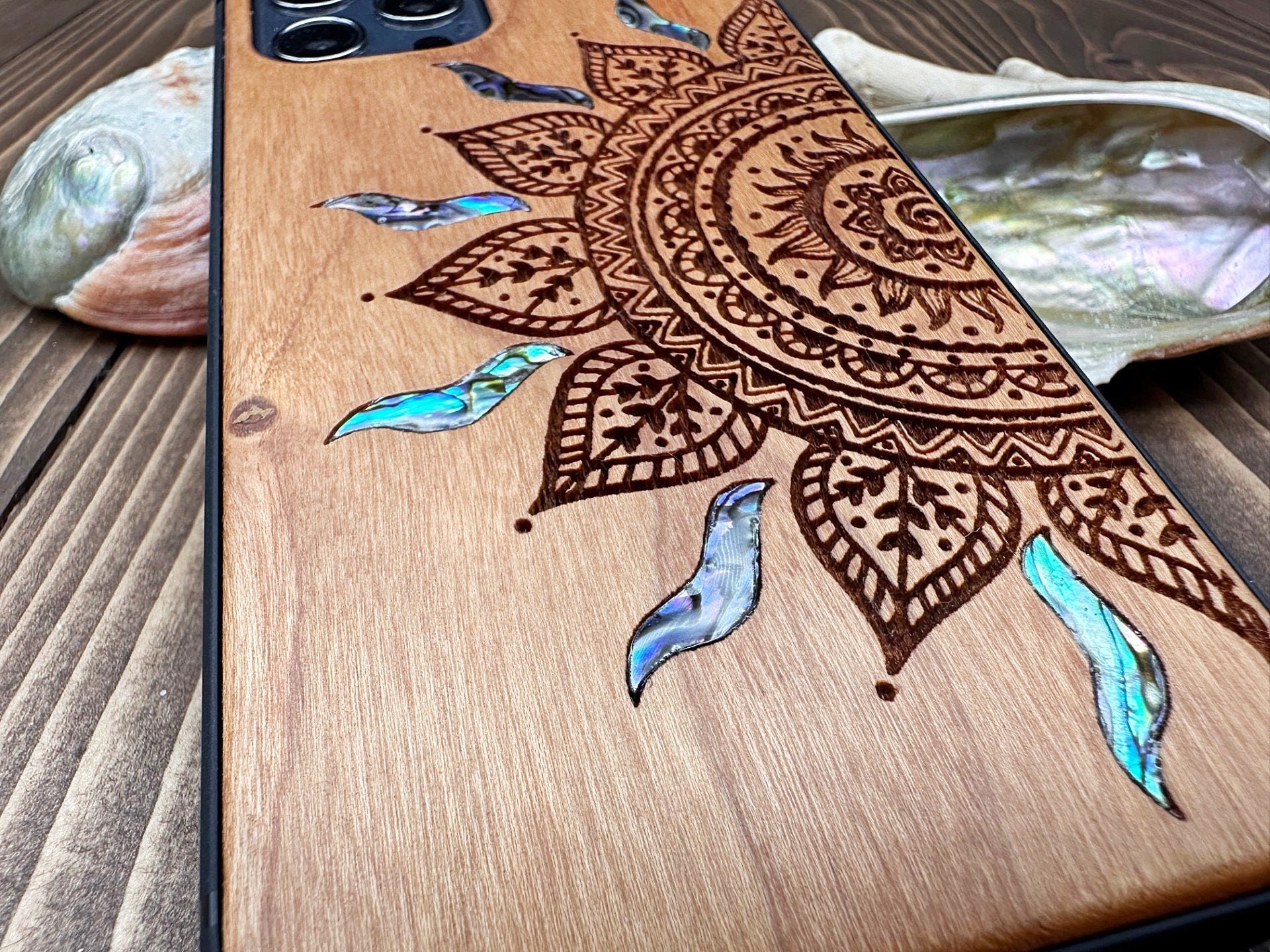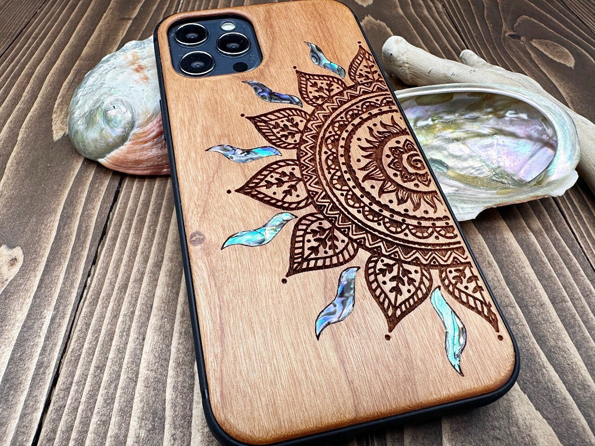 Iphone case with half mandala design is engraved on Cherry, Rosewood, and black painted bamboo wood using Abalone inlay. It can be personalized with your writing, name, etc. at no extra cost.