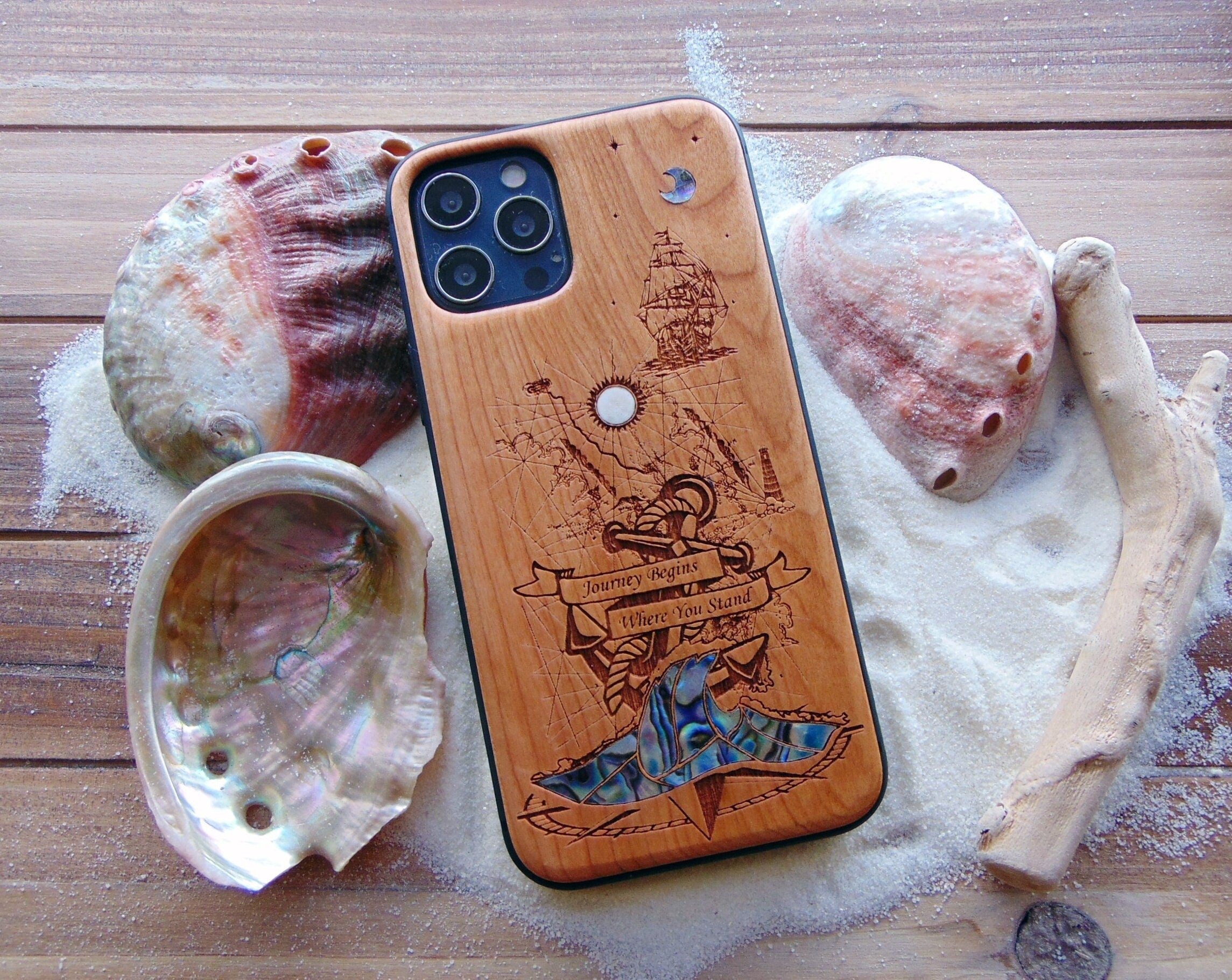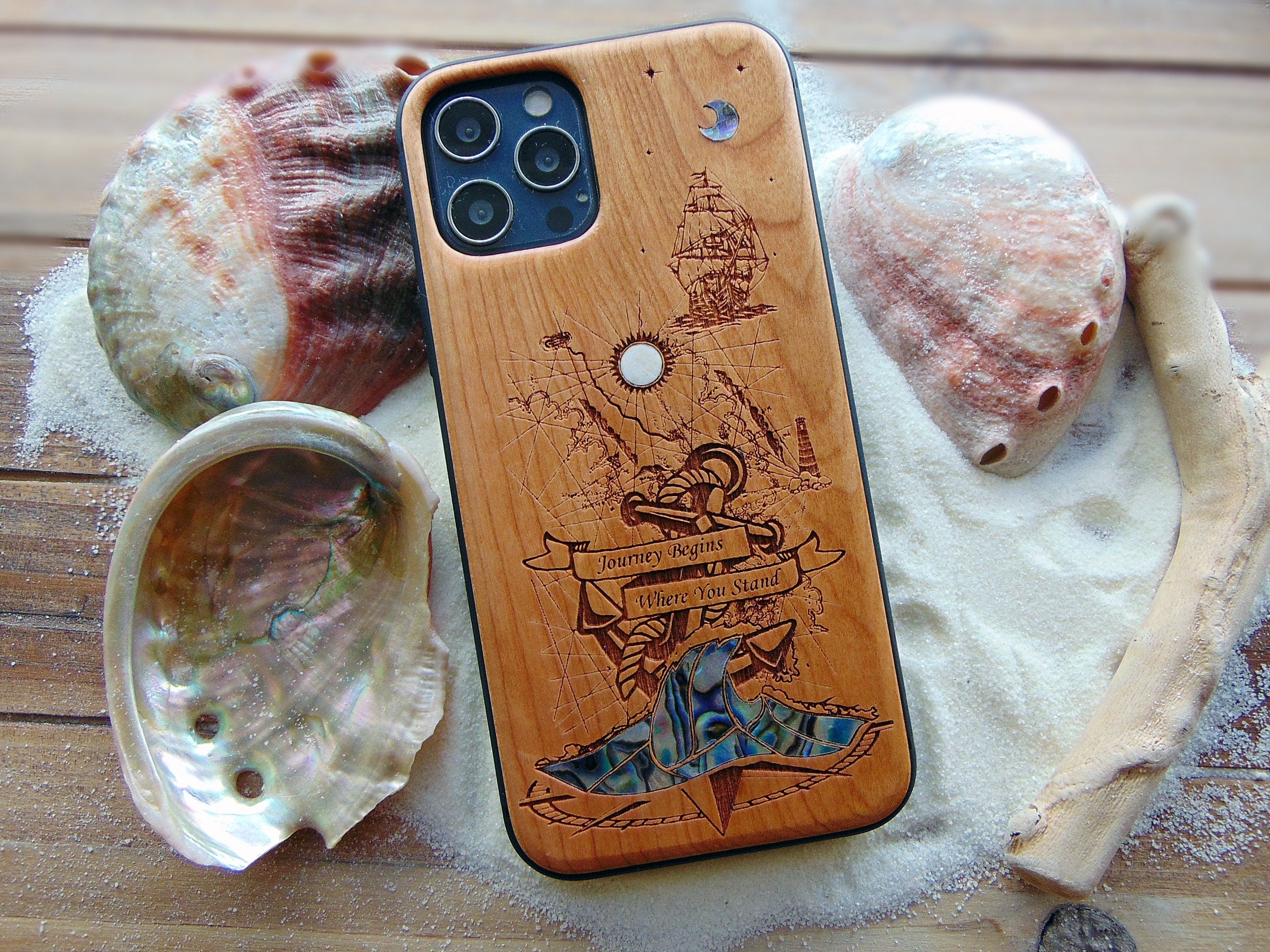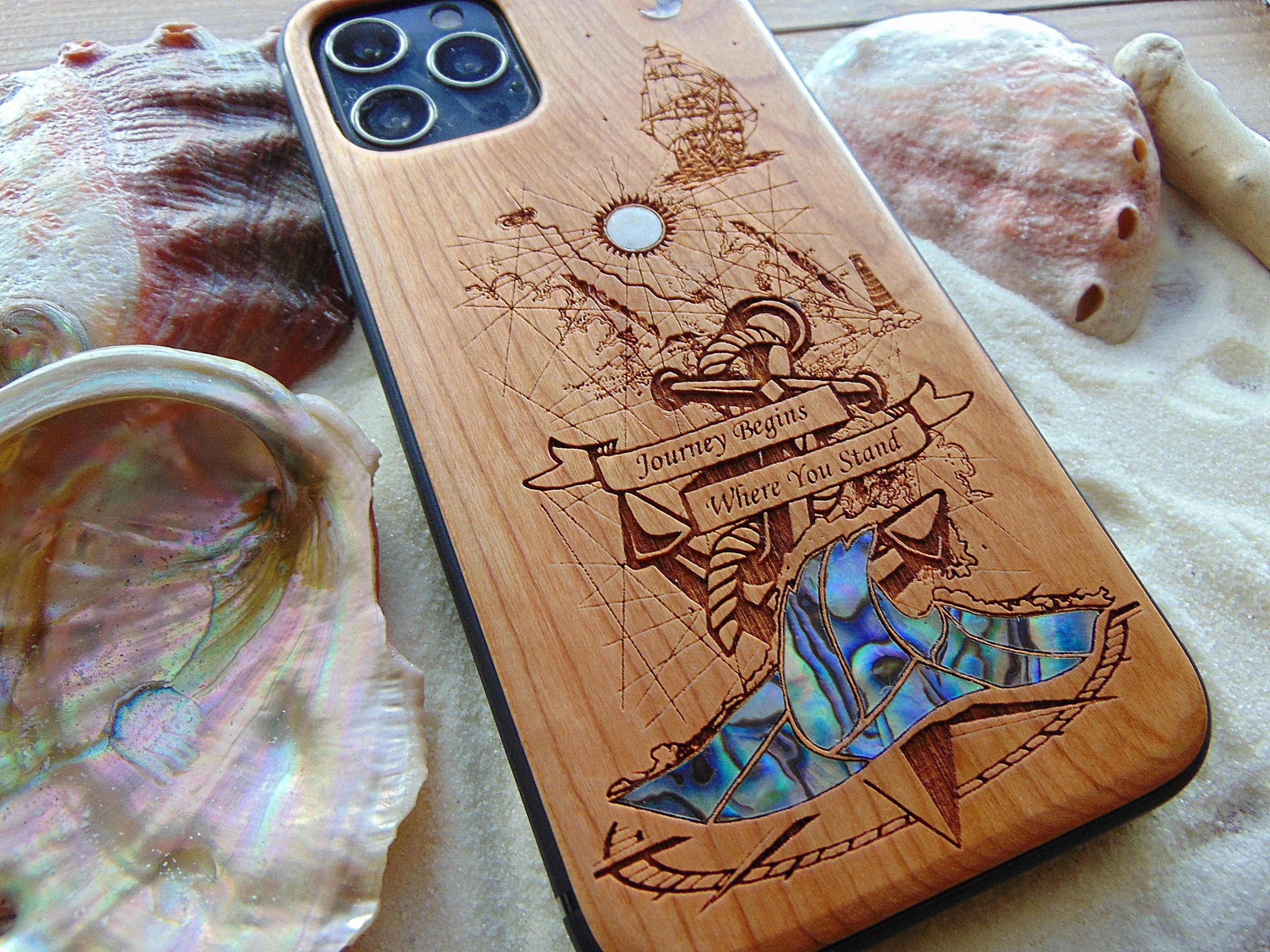 Inserting Mother of Pearl or Abalone shell into the surface of an object (Wood in this case) is called an inlay. In old days this was done all by hand, nowadays we use a laser cutter to cut and engrave our wood and hand inlay the pieces.