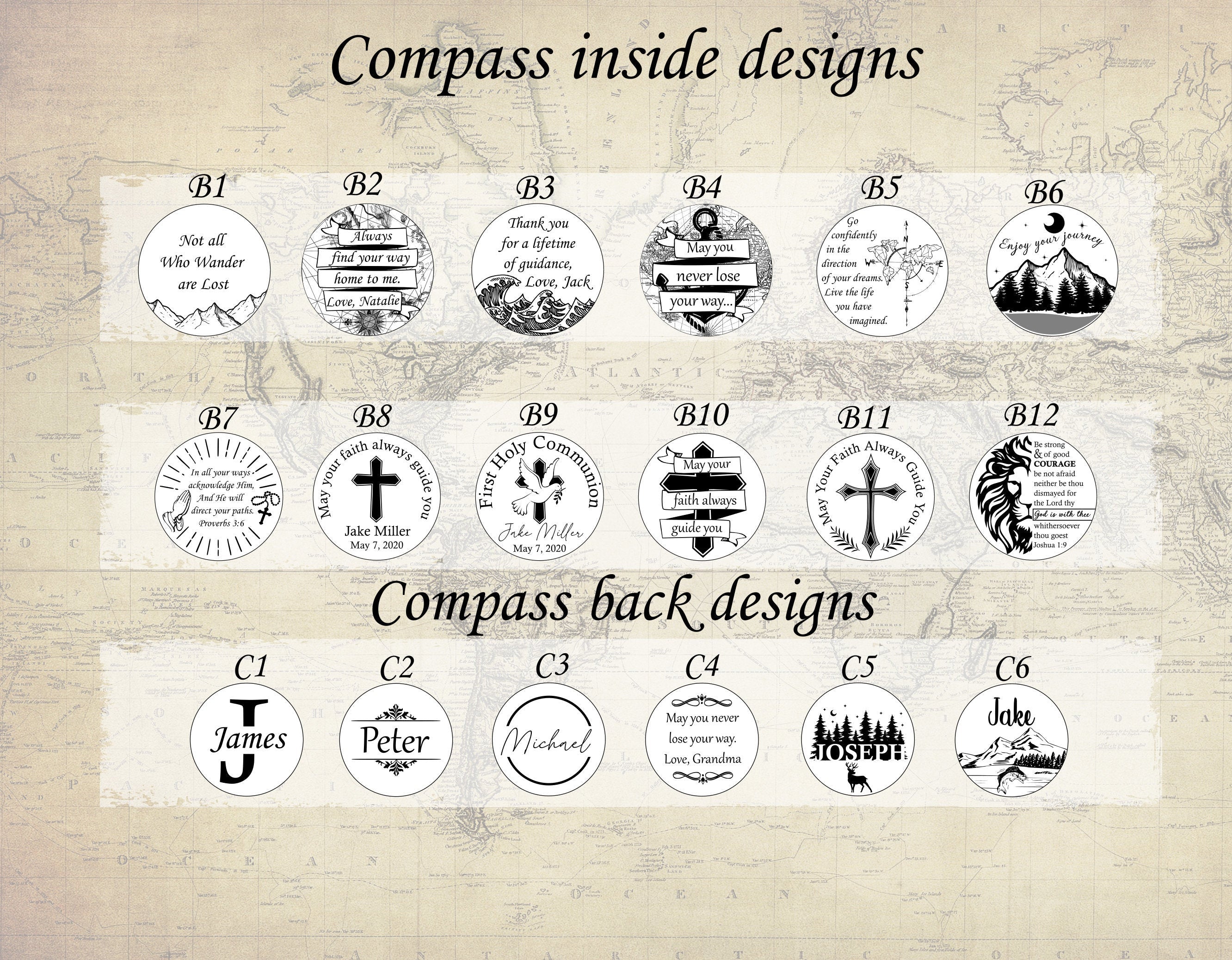 We engrave on the wooden piece under the cover or on the box as well as on the compass itself. The box engraving is decorated with abalone or mother of pearl shell inlay.