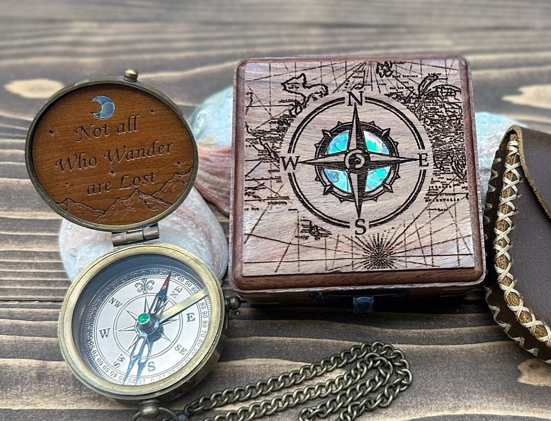 We engrave on the wooden piece under the cover or on the box as well as on the compass itself. The box engraving is decorated with abalone or mother of pearl shell inlay.