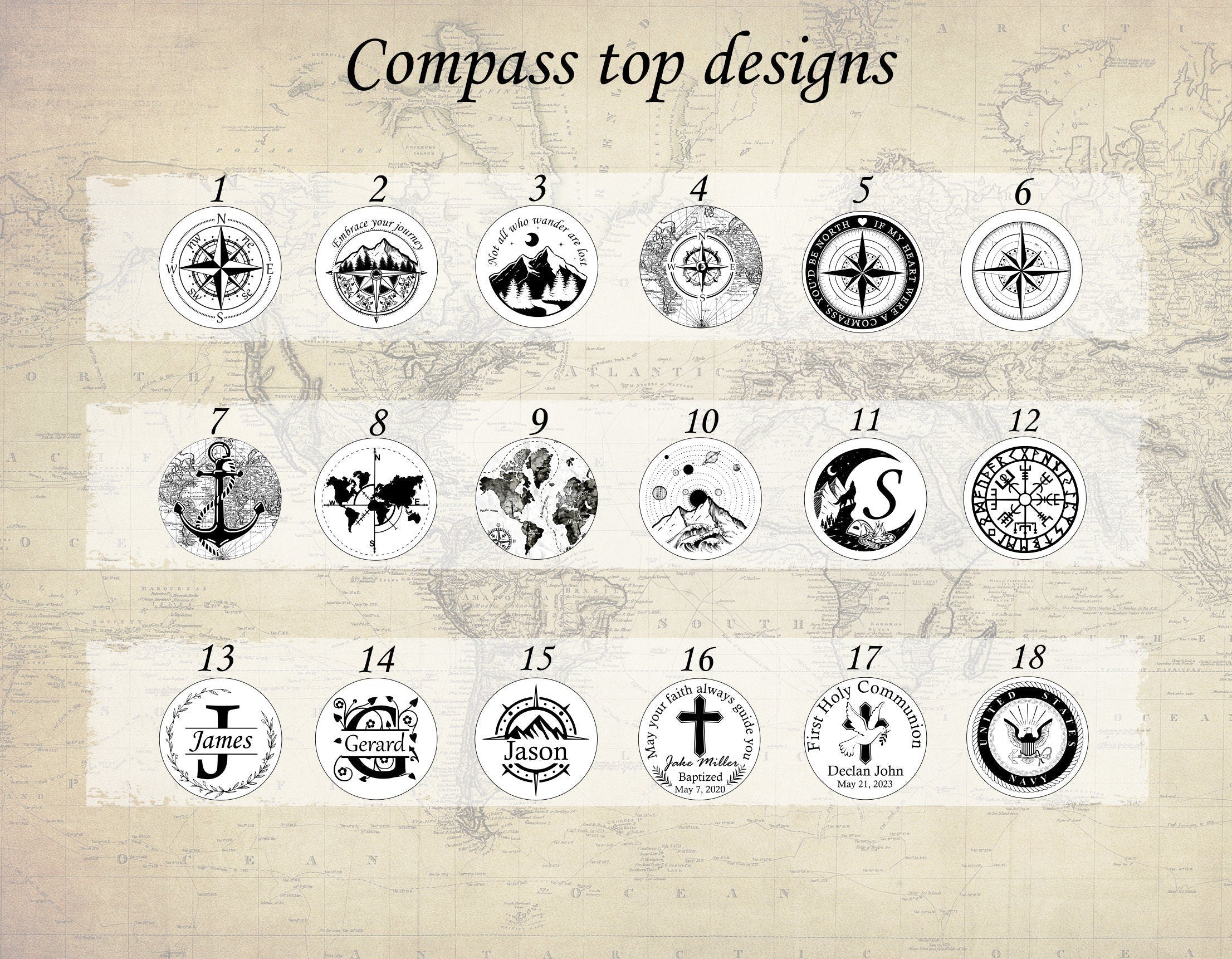 We engrave on the wooden piece under the cover or on the box as well as on the compass itself. The box engraving is decorated with abalone or mother of pearl shell inlay.