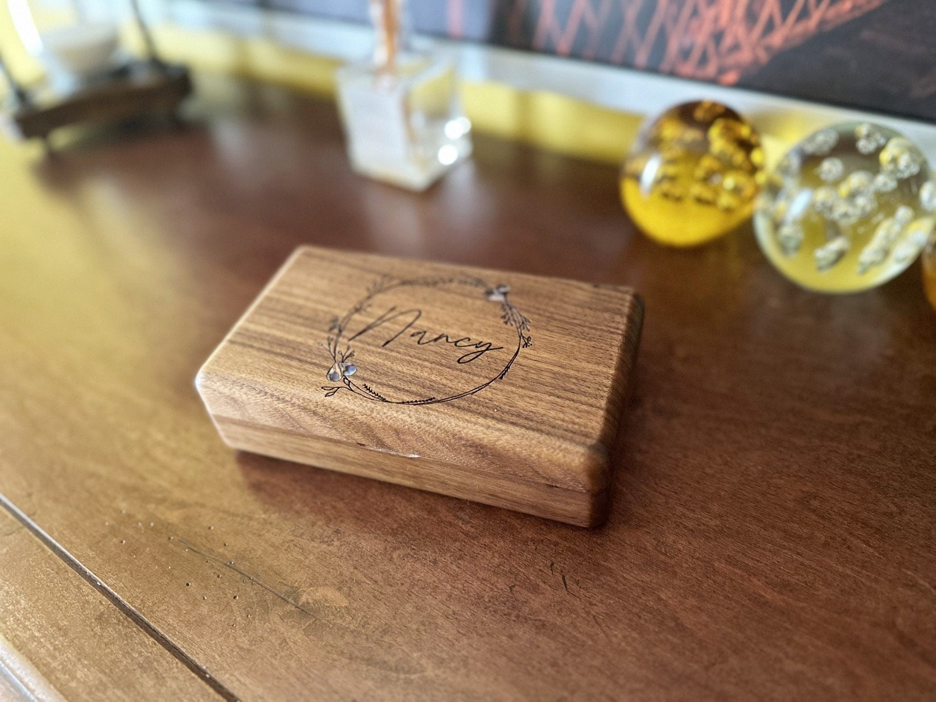 Engraved solid walnut wood jewelry box with abalone shell inlay.