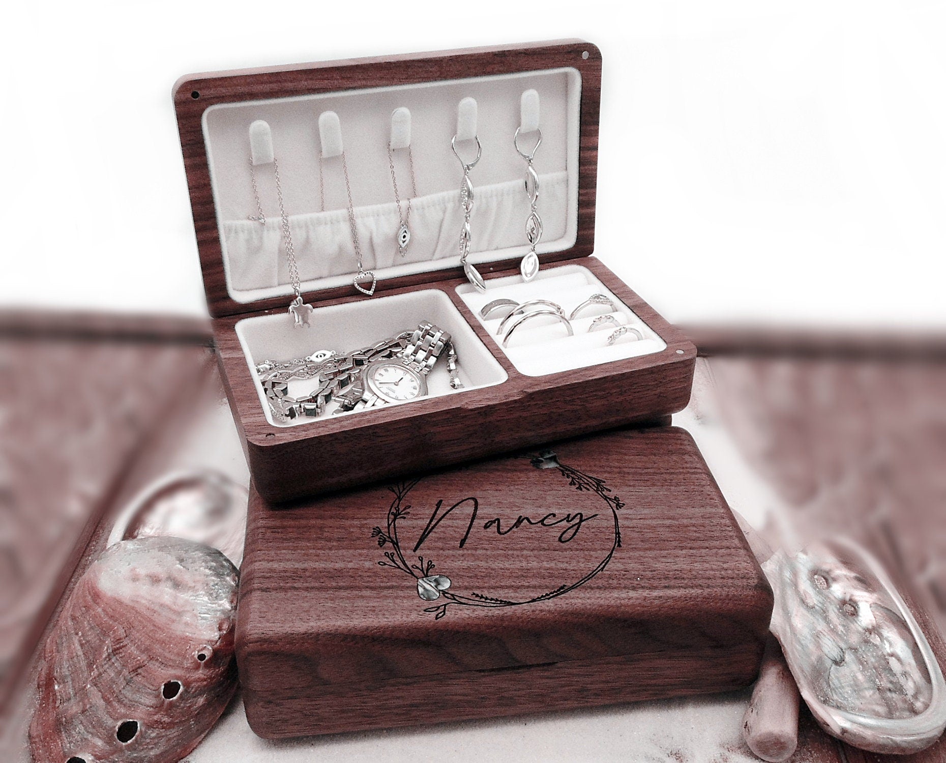 Wooden jewelry box with velvet interior cream lining for earrings, bracelets, bangles, necklaces, rings, watches, and pins storage, perfect for daily use or gift. For holidays, anniversaries, weddings, Valentine's Day, and Mother's Day, great for travel use.