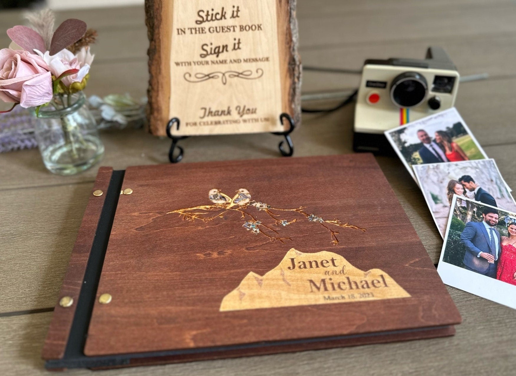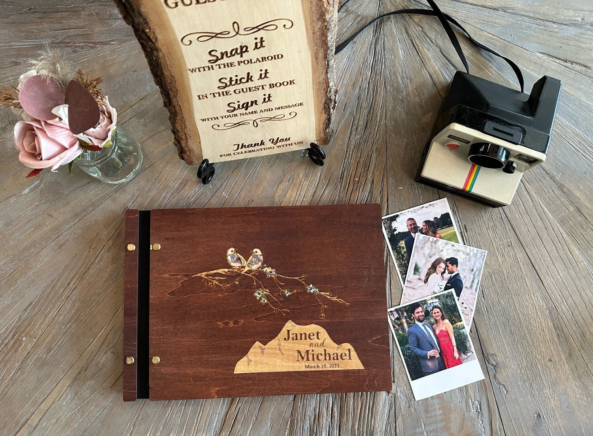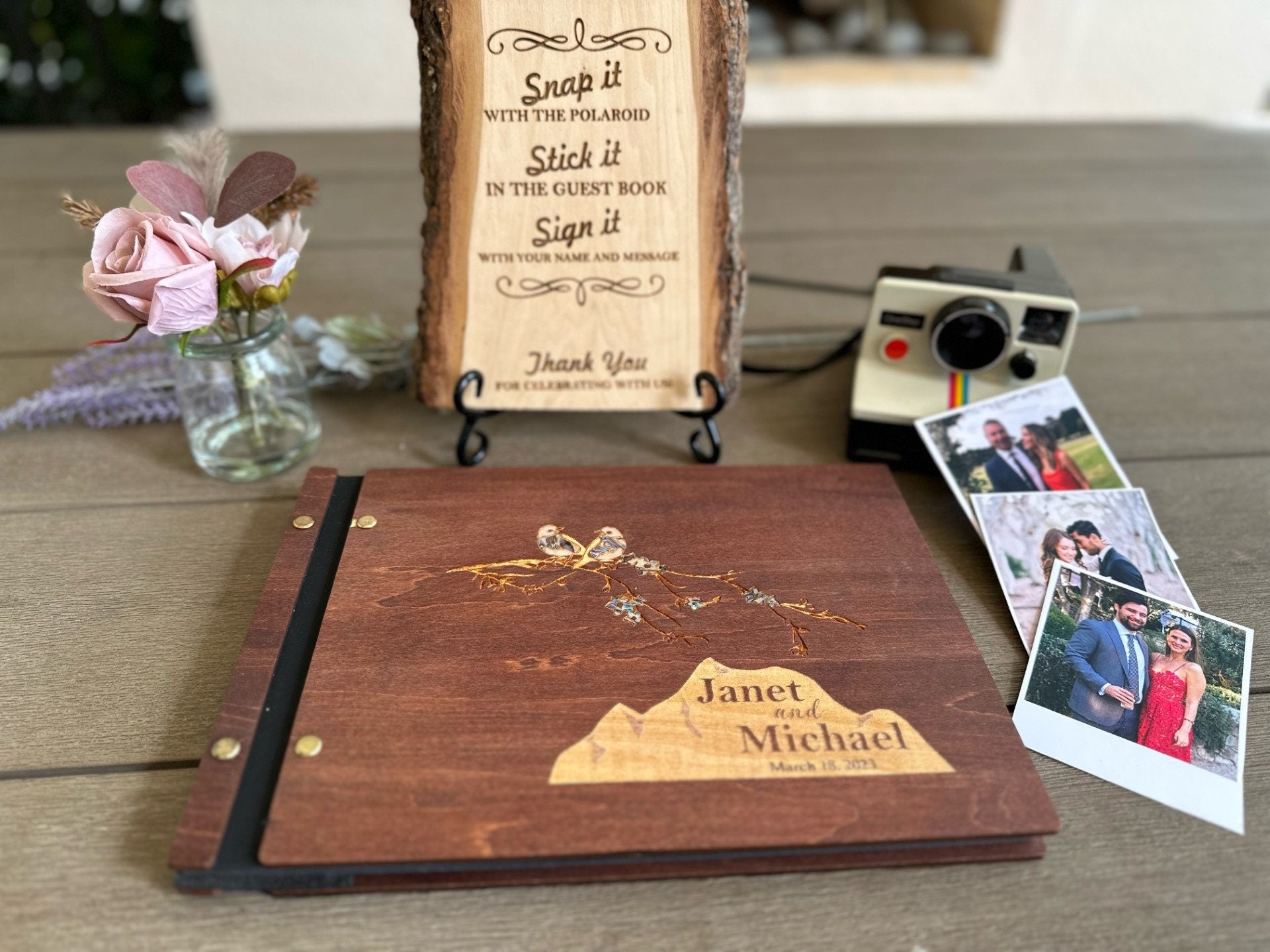 Personalized Polaroid Guest Book for Weddings - Engraved Wood Cover, Photos & Messages, Rustic Photobooth Album