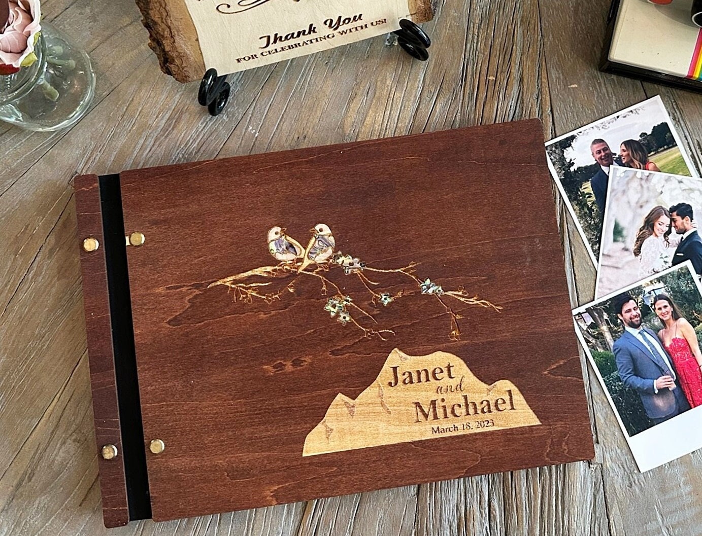 Introducing our exquisite Wooden Wedding Guest Book, meticulously crafted and personalized with laser engraving to capture the essence of your special day. This elegant masterpiece is not just a guest book, but a cherished keepsake that will exude timeless beauty. With its spacious pages, it allows ample room for heartfelt messages, cherished photos, and beautiful memories. Whether it's used at your photobooth, displayed as a photo album, or treasured as a wedding album, this wooden guest book will be a cherished symbol of your love story for years to come.
