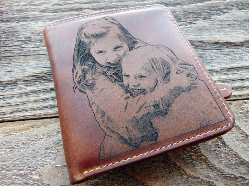 It's made from full-grain cowhide leather which means it is of the highest quality and will stand up to plenty of abuse. The leather is completely buffed and smoothed out during processing which gives it a very rich, smooth color that makes it ideal for photo engraving.