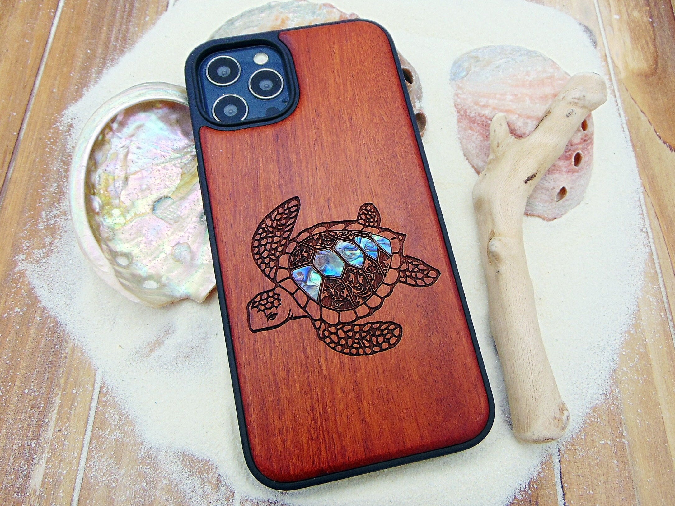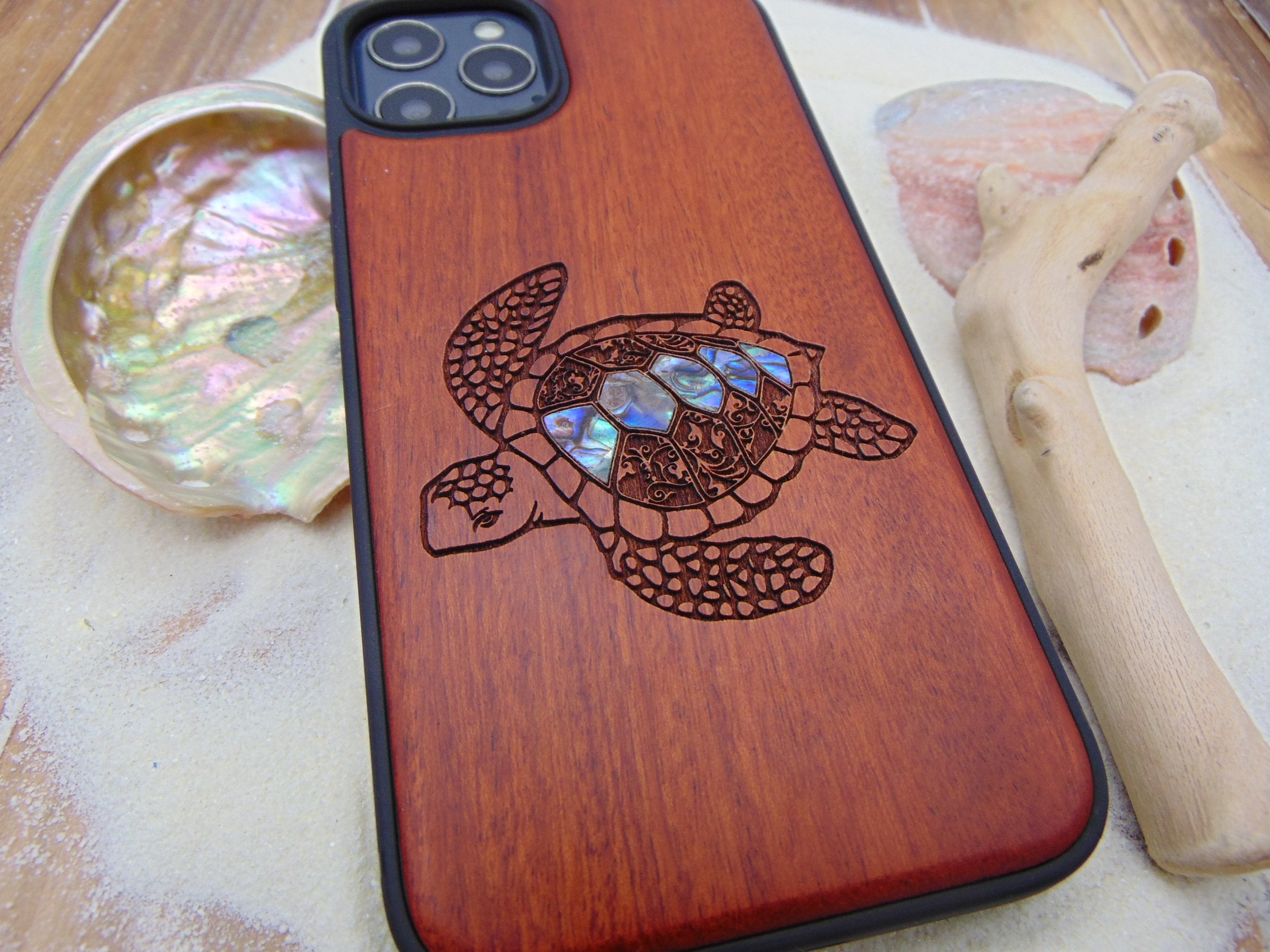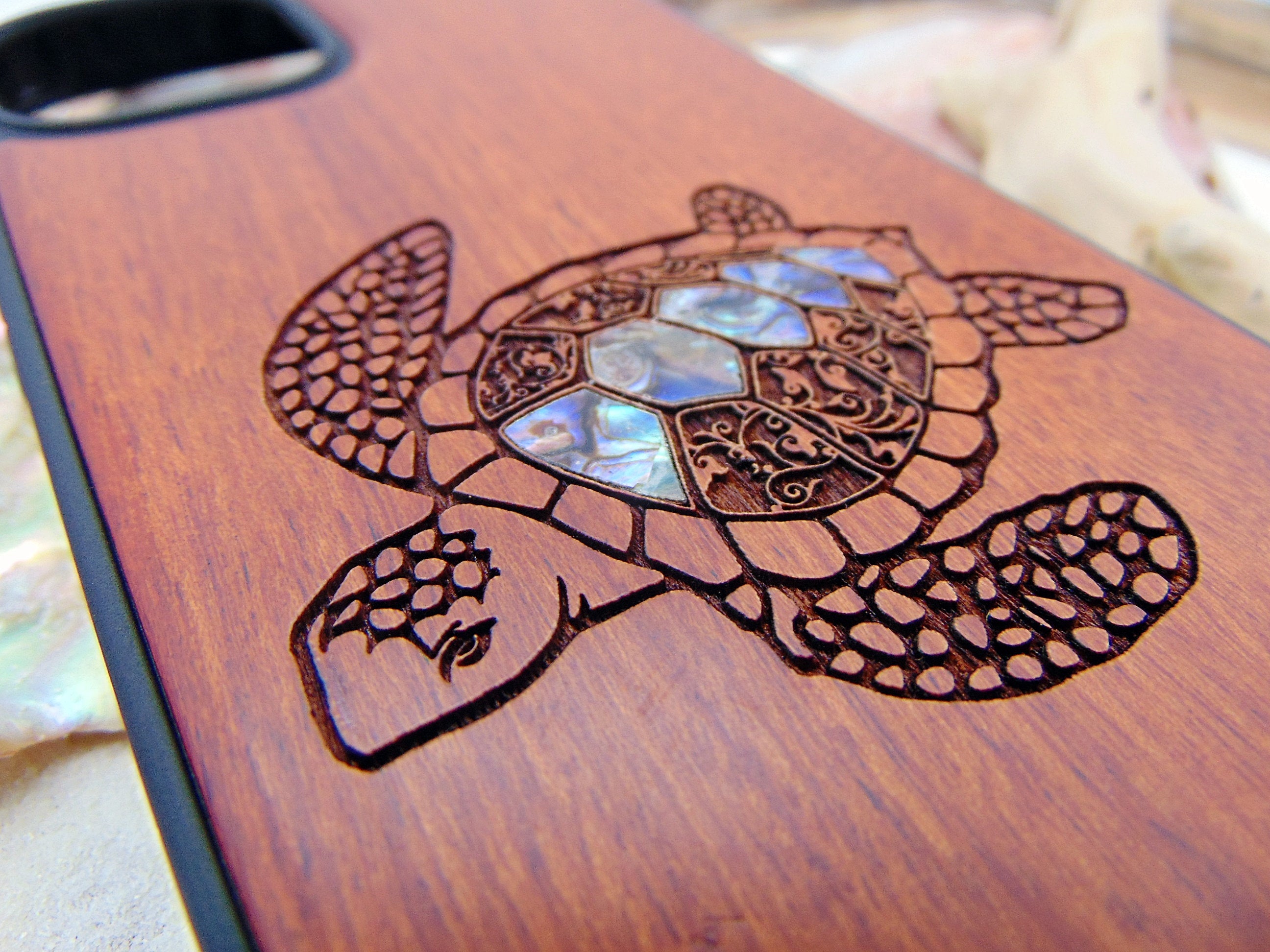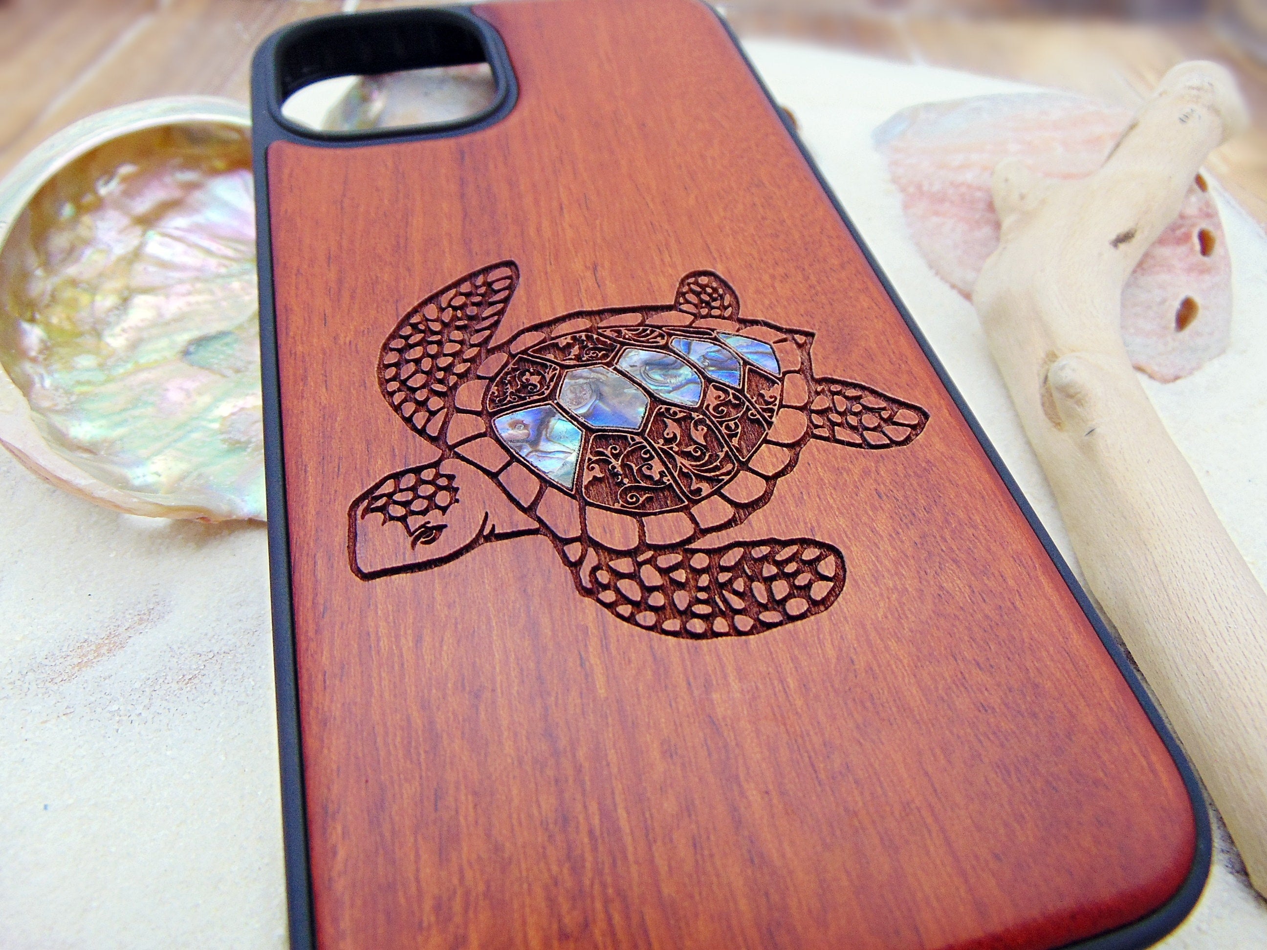 Phone case with sea turtle design is engraved on Cherry, Rosewood, and black painted bamboo wood using Abalone inlay. It can be personalized with your writing, name, etc. at no extra cost.